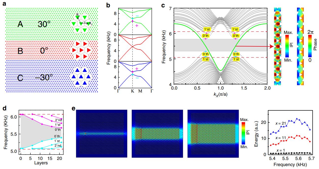 谷指数标记了动量空间中色散关系的一对极值,可作为一个新的自由度操控电子和各种经典波,近年来受到广泛关注。这项研究利用三个含谷指数的声子晶体相组成三明治状的异质结构(图1),实现了拓扑保护的波导输运。这个波导态具有无带隙的色散和谷锁定的传播方向,具有抗散射能力,能实现无障碍传输。与具有拓扑界面态的简单两相畴壁结构相比,这个具有拓扑波导态的三相异质结构多了厚度属性,因而具有高通量,并能更方便地与现有声学器件进行对接。他们用这个异质结构实现了新颖的声波操控,例如声波分束,无反射输运和能量汇聚等(图2)。