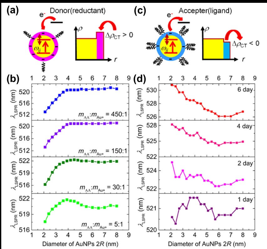 图1 表面电子注入和抽取调控Au纳米颗粒量子等离激元的尺寸依赖关系。