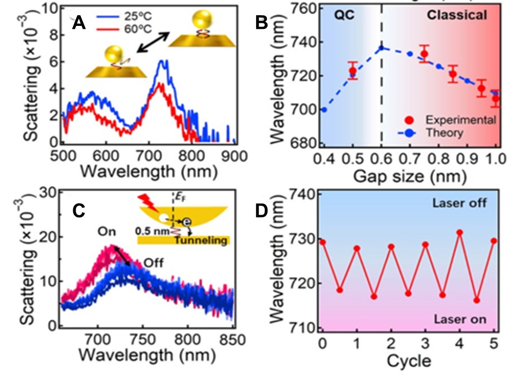 在量子隧穿极限附近,等离激元谐振随着纳米间隙的不断减小呈现出先红移后蓝移的特征,与经典和量子校正模型吻合较好(2B)。在量子隧穿状态下,研究者们观测到等离激元诱导热电子隧穿可使纳米间隙的电导率增加,导致量子等离激元发生可逆蓝移(图2C,D),这为光学可调谐的量子等离激元提供了器件原型。