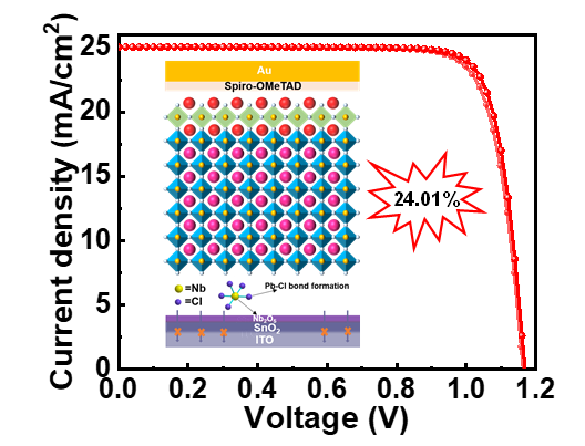 传统的外部封装技术作为一种直接的工艺手段,可一定程度地阻隔空气中的水氧从而提高钙钛矿电池的环境稳定性。然而由电池内部的缺陷、离子迁移和扩散导致的不可逆光降解是传统外部封装所不能解决的。因此本文提出了一种具有双界面修饰的内封装策略,全方位地钝化缺陷和减少离子迁移通道来抑制碘离子迁移。即一方面在二氧化锡电子传输层表面旋涂一层氯化铌然后低温退火形成含氯的五氧化二铌。含氯的五氧化二铌不仅能为钙钛矿吸光层与二氧化锡电子传输层提供一个更好的能级阶梯结构;同时氯能与钙钛矿下界面未配位的铅相互作用成键,钝化钙钛矿下界面缺陷形成更贯穿更大的钙钛矿晶粒;还可以减少钙钛矿体相和表面的残余碘化铅,从而实现钙钛矿的底层封装。另一方面再在钙钛矿表面旋涂一层正丁基溴化铵形成二维钙钛矿,进一步减少表面缺陷和残余碘化铅,从而同时实现对钙钛矿的顶层封装。通过器件优化,最终获得24%的光电转换效率,同时器件在经过1000小时最大功率跟踪测试(55℃温度下持续光照)后仍能保持88%的初始效率。