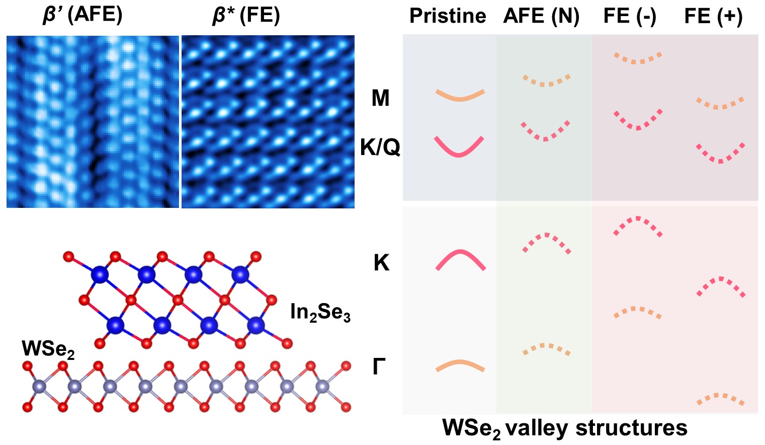 张晨栋课题组通过分子束外延生长的方法,在双层石墨烯/碳化硅衬底上实现了单层极限下In2Se3/WSe2异质结的可控制备。同时,通过原位的低温扫描隧道显微镜测量,发现单层In2Se3具有两种不同的相,分别是具有面内反铁电性的b和面内铁电性的b*,并且确定了单层In2Se3/WSe2界面处为II型能带排列。进一步,发现了单层WSe2的能谷结构的显著调制,通过铁电和反铁电In2Se3相的原位相变证实了顶部In2Se3层中的铁电极化对调制起主导作用。这种现象可归因于平面外电场的一级和二级斯塔克位移(Stark shift)的结合。这是目前首次在单原子层材料中实现显著的斯塔克位移的实验工作,为调控能谷结构提供了一种新思路。