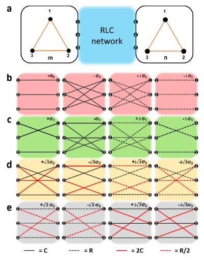 在此工作中,研究人员提出了在电子线路中实现非阿贝尔规范场的方案(图1)并展示了与非阿贝尔规范场相关的三个有代表性的物理效应,分别是自旋-轨道耦合效应,陈拓扑绝缘态,以及实空间中的非阿贝尔Aharonov-Bohm效应。此方案基于电路基尔霍夫方程和群论知识,具有很强的普适性,可以构建任意形式的SU(2) 规范场且不受空间维度的制约。为研究任意空间维度下自旋-轨道耦合相关的物理、拓扑物态、以及非阿贝尔规范场相关的物理提供了方便可行的新途径。
