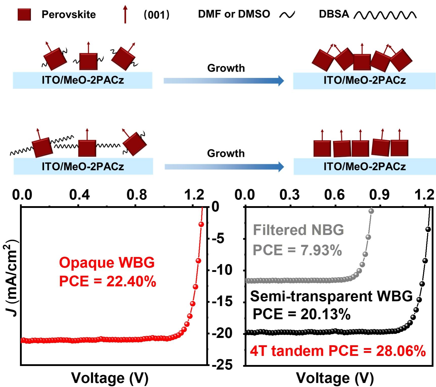 除了窄带隙锡铅混合钙钛矿,构筑全钙钛矿叠层电池还需要高性能的宽带隙混合卤素钙钛矿。然而,宽带隙混合卤素钙钛矿电池的严重的开路电压损失(VOC)和光致卤化物相偏析是领域内的共性挑战。鉴于此,作者提出了一种通过在钙钛矿前驱体溶液中引入十二烷基苯磺酸(DBSA)分子的方法,大幅度提高了宽带隙钙钛矿的VOC和稳定性。使用该方法能明显增大宽带隙钙钛矿薄膜的晶粒尺寸、优化结晶取向、钝化晶体缺陷、有效抑制光致相偏析和抑制非辐射复合等。将1.66 eV带隙的宽带隙钙钛矿太阳能电池的VOC损失降至0.39 V,同时实现了同类无甲胺基的宽带隙钙钛矿电池的当时世界最高效率22.40%(认证效率21.97%),还显著提高了器件的光稳定性和湿度稳定性。此外,基于优化后的宽带隙钙钛矿构筑的四端全钙钛矿叠层电池实现了28.06%的高光电转换效率。论文题目为“Regulating Crystal Orientation via Ligand Anchoring Enables Efficient Wide-Bandgap Perovskite Solar Cells and Tandems”《通过配体锚定调节晶体取向实现高效的宽带隙钙钛矿太阳能电池和叠层电池》,博士生管红令为论文第一作者,该工作发表在Advanced Materials。