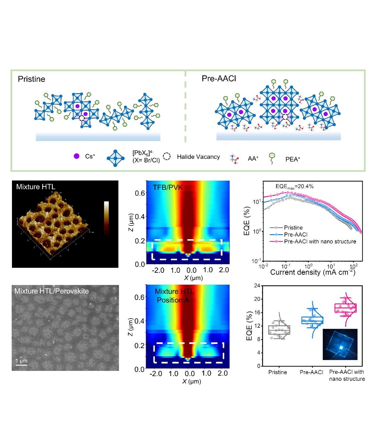 针对上述问题,武汉大学方国家教授、柯维俊教授、林雪平大学高峰教授近日在《Science Bulletin》期刊上发表了题为:“Buried interface modification and light outcoupling strategy for efficient blue perovskite light-emitting diodes ”的文章。在这项工作中,作者提出了一种埋底界面修饰策略,通过关注器件的底部空穴传输层(HTL)来解决这些问题。一方面,引入了一种多功能分子,甘氨酸盐酸盐(AACl),用于修饰HTL/钙钛矿界面,以调节钙钛矿的结晶。实验研究和理论计算表明,AACl可以通过抑制低n值低维钙钛矿相的生长并有效减少体块钙钛矿中的非辐射复合损失。另一方面,在空穴传输层中巧妙地应用了一种自组装纳米网结构来提高出光效率。通过将聚合物TFB和PVK的溶液混合制备了这种纳米网结构,显著提高了PeLEDs的光耦合取光效率。最终,制备了发光峰位峰位于487 nm的天蓝光PeLEDs,外量子效率达到了20.4%;同时也制备了峰位于470 nm处的纯蓝光发光二极管,其外量子效率为12.5%;这些都是同类器件报道的世界最高效率之一。这项工作为实现高性能蓝色PeLEDs提供了新思路。
