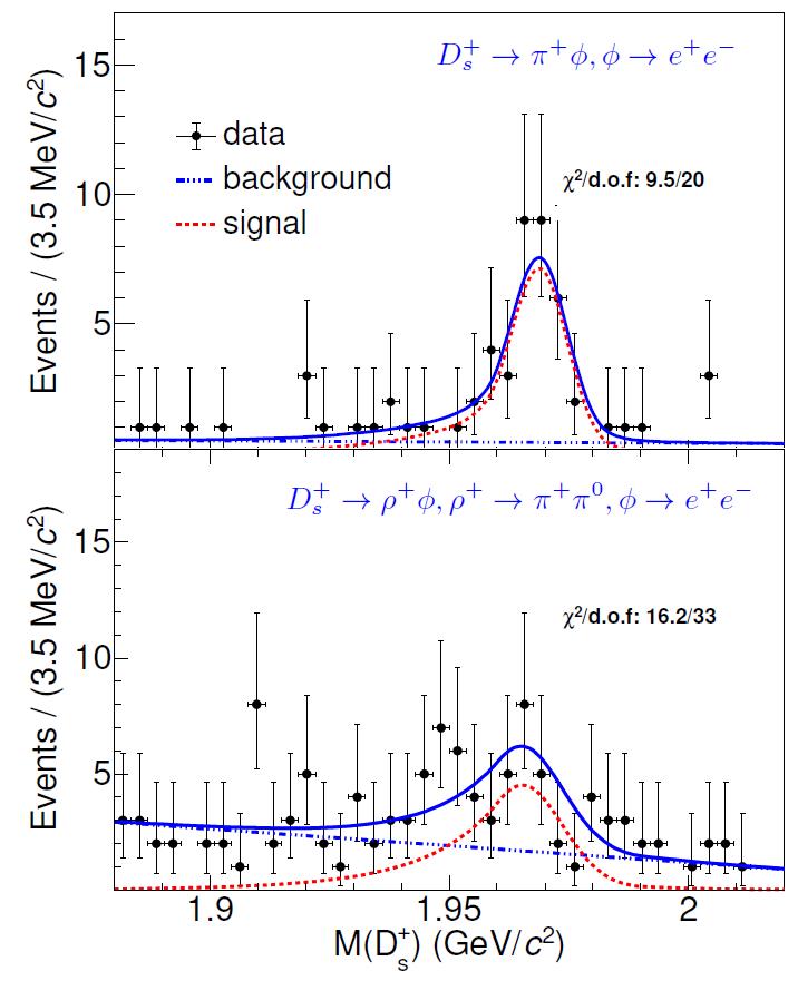 图1:通过拟合北京谱仪III实验数据分别提取了38.2+7.8-6.8个Ds+ →π+ ϕ(→e+ e-)信号和37.8+10.3-9.6个Ds+ → ρ+ ϕ(→e+ e-)信号。