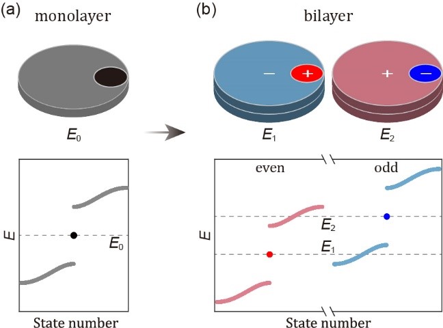 图1.构造拓扑BIC的镜面堆垛方案。(a) 边界上存在拓扑束缚态的单层模型;(b)镜面双层堆垛系统,承载不同镜面宇称的拓扑BIC。