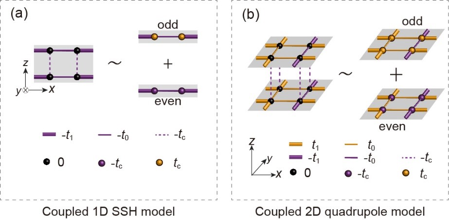 图2.应用举例。(a) 一维双层Su-Schrieffer-Heeger模型,实现低阶拓扑BIC;(b) 二维双层四极子模型,实现高阶拓扑BIC。