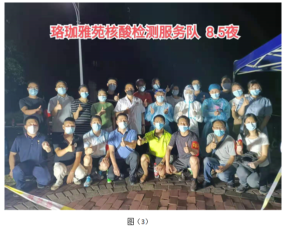 王晓峰同志(图1)看到广八路社区党员下沉群征集电脑高手完成社区信息录入、信息排查以及信息比对工作,结合自己的特长积极响应,尽量做到排查信息不漏一人。刘海林同志(图2)深入老年人活动中心核酸检测现场服务,并为后面的 入户排查核酸检测情况积极贡献力量。周利同志参与了8月5日珞珈雅苑社区核酸检测志愿服务(图3),回顾下沉经历他感叹到“我看到了训练有素的医护队伍和社区工作人员、积极报名的党员志愿者、没有慌乱秩序井然的小区居民,也看到了最终战胜新冠疫情的希望!”支部成员方国家、吴恒毅、尹蕾等都积极参与了社区的下沉服务。郑明飞同志作为武大文理学部九区11栋一门的唯一下沉党员,积极配合社区网格员的工作安排,他认为“对于下沉党员来说,这不仅是一场体验和感悟,更是一种强化责任担当的初心和使命!”