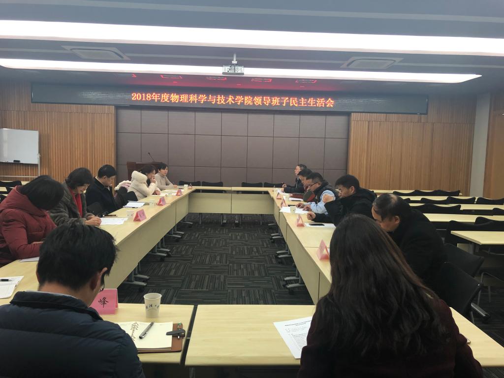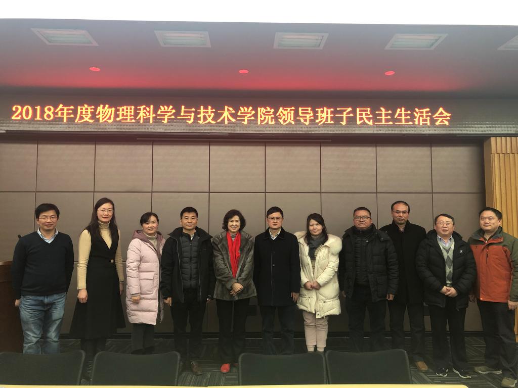 2019年1月16日下午,物理科学与技术学院在新楼五楼多功能厅召开2018年度中层党员领导干部民主生活会,副校长舒红兵院士出席会议,督导组党政办公室赵琴副主任和离退休处办公室吴仪主任到会督导,学院领导班子成员王建波、徐红星、乔豪学、陈志权、方国家、李利华、张一飞和张宇宁参会,列席会议的还有院长助理任峰教授和学院党政办公室主任龚荣老师。
