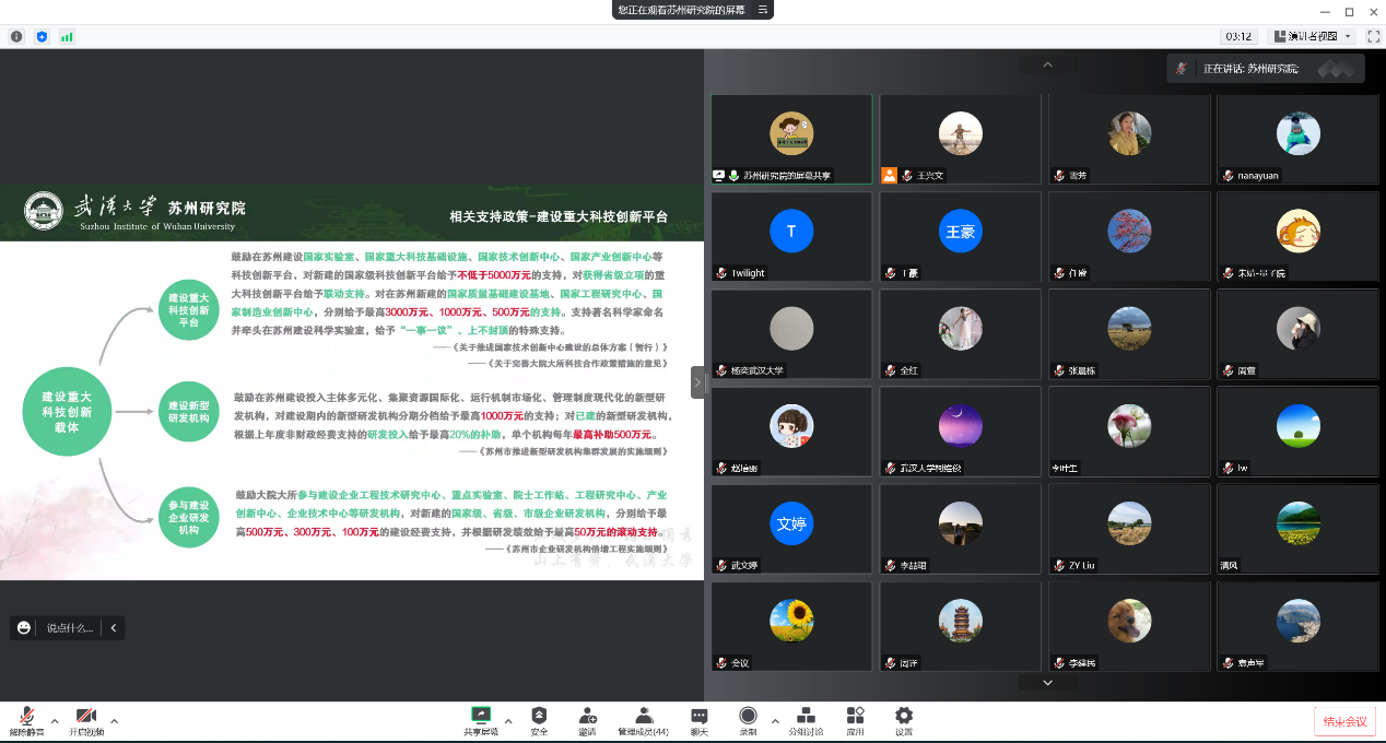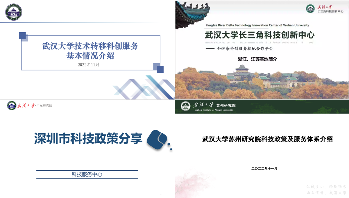 王建彤副总经理就学校开云链接官网(中国)有限公司-官网技术转移与成果转化的总体情况进行了详细解读,具体内容包括学校技术转移中心机构变迁、学校在成果转化方面的实践探索和相关成功案例介绍。孟虹兆主任介绍了学校全链条科创服务校地合作平台——武汉大学长三角科技创新中心,重点介绍了学校浙江、江苏基地。任盛主任对深圳市和广东省科技政策进行了解读,包括深圳市科技计划体系、承接国家重大科技项目管理办法及广东省基金项目资助体系等。王丽副主任重点解读了苏州科技创新环境、高校来苏州科技创新支持政策、苏州研究院科技工作服务体系及光子产业项目征集。