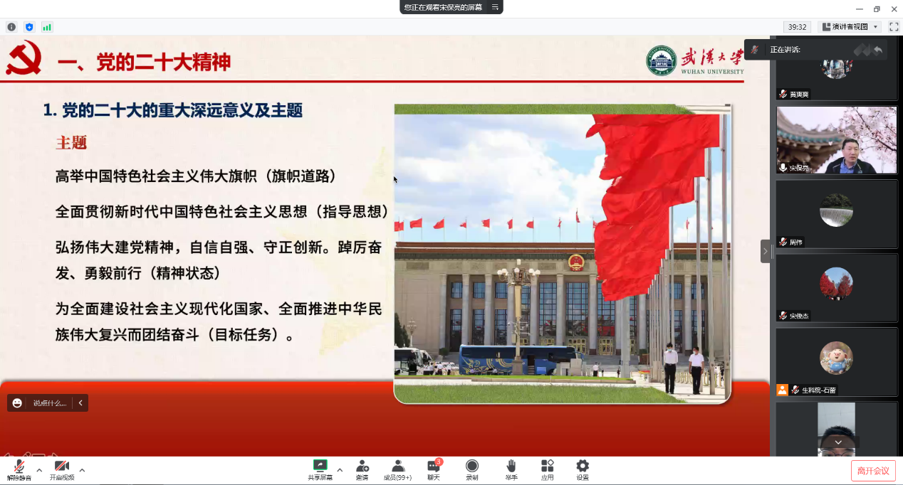12月22日,校党委常委、副校长、中国科学院院士宋保亮同志以“践行二十大精神,走好科技创新发展之路”为题,宣讲党的二十大精神。活动采用线上方式进行,来自学校相关部门和院系的师生党员代表在线参会,物理科学与技术学院领导班子全体成员、教师第一党支部全体党员聆听学习了报告。