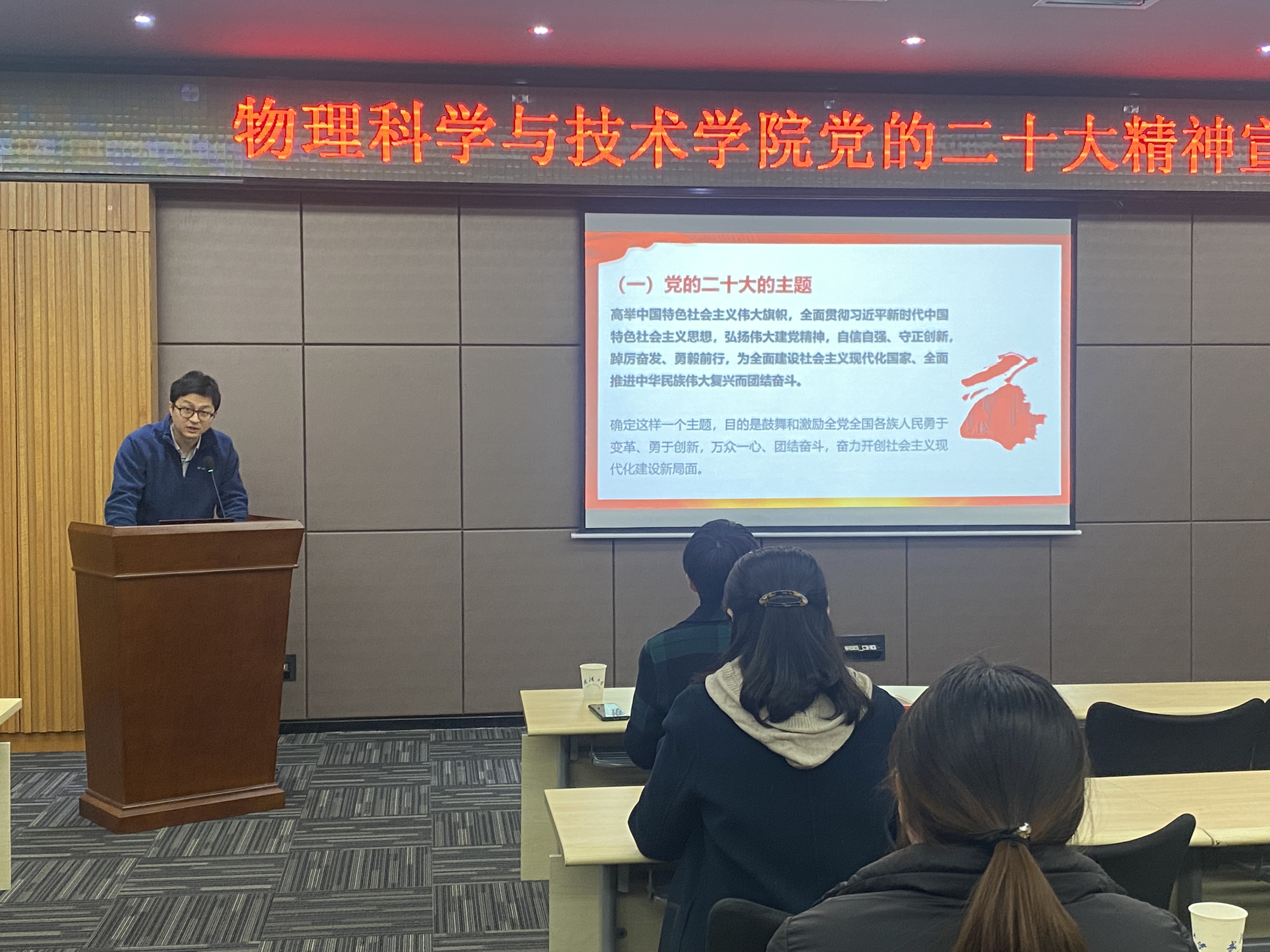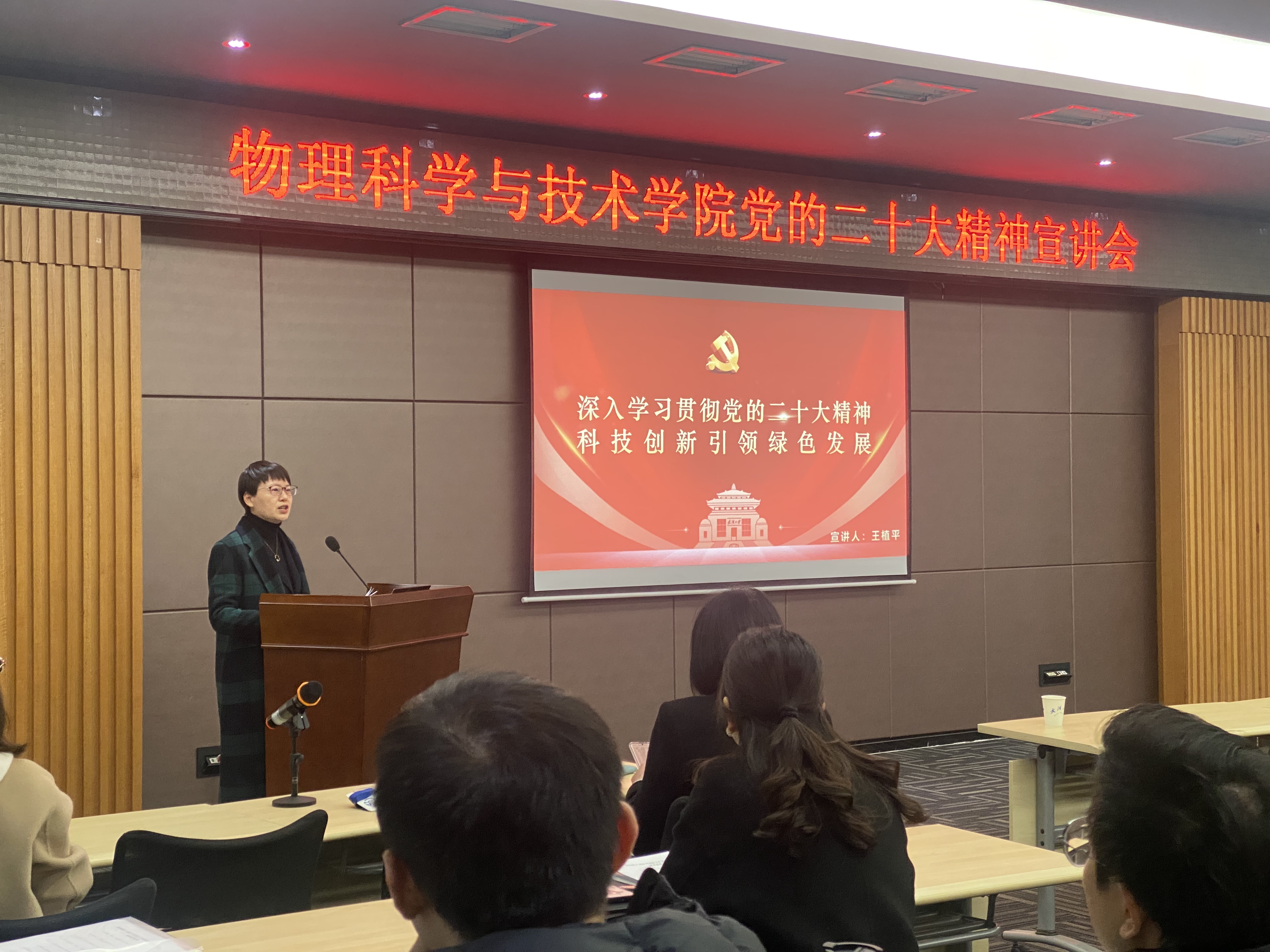 2月16日下午,物理科学与技术学院举行党的二十大精神学习活动,学院领导班子、各党支部委员和党员代表40余人参加,活动由党委书记余向红主持。4位报告人先后上台,他们是青年教师,是国家级人才,还是学校理论宣讲专家。报告内容既立意高远、鼓舞人心,又结合实际、形象生动,现场掌声不断。