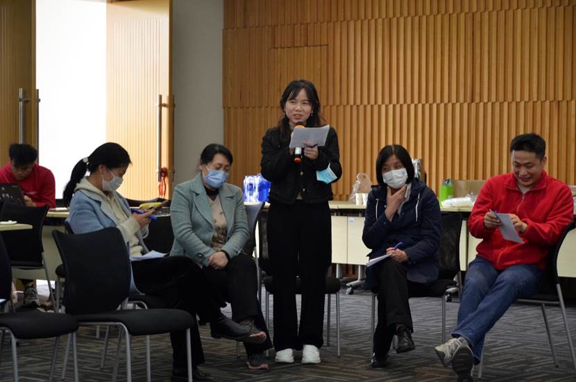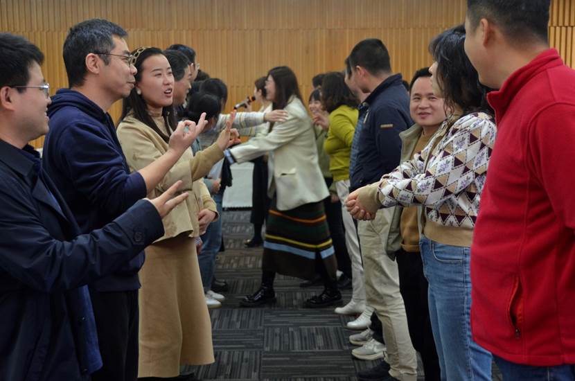 讲座开始汪女士通过一个简单的“1-2-3-4”互动小游戏,在点头-握手-拍肩-拥抱中拉进彼此的距离,直面自己的心理活动。随后她又从幸福的人际关系、自我认知、团队协作以及价值体现等几个方面,通过精彩的理论解读、实例分析、画图表述、心理测试以及互动小游戏等形式,引导大家感知幸福,正视自我。整场讲座参与老师们在生动有趣而又直击心灵的互动游戏中放下心防,一边听老师讲一边自我剖析,并积极和新老朋友们讨论分享。讲座在有趣的模拟“价值拍卖会”中达到高潮,老师们纷纷离开自己的座位,按照性格测试结果分组协作,在激烈的讨论、竞争和真诚的分享中加深对自我需求、价值取舍的了解。