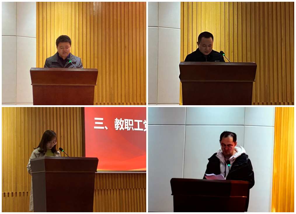 大会第二阶段,学院四个在职教职工党支部的支部书记进行了现场述职,教师第一党支部书记刘晓泽、教师第二党支部书记柯维俊、办公室党支部书记龚荣、弘毅学堂教职工党支部书记李宁依次汇报了2022年度各党支部在学习贯彻习近平新时代中国特色社会主义思想和党的二十大精神、推进党史学习教育常态化长效化、促进党建与业务工作深度融合、提升党支部标准化规范化建设质量等方面的工作情况。