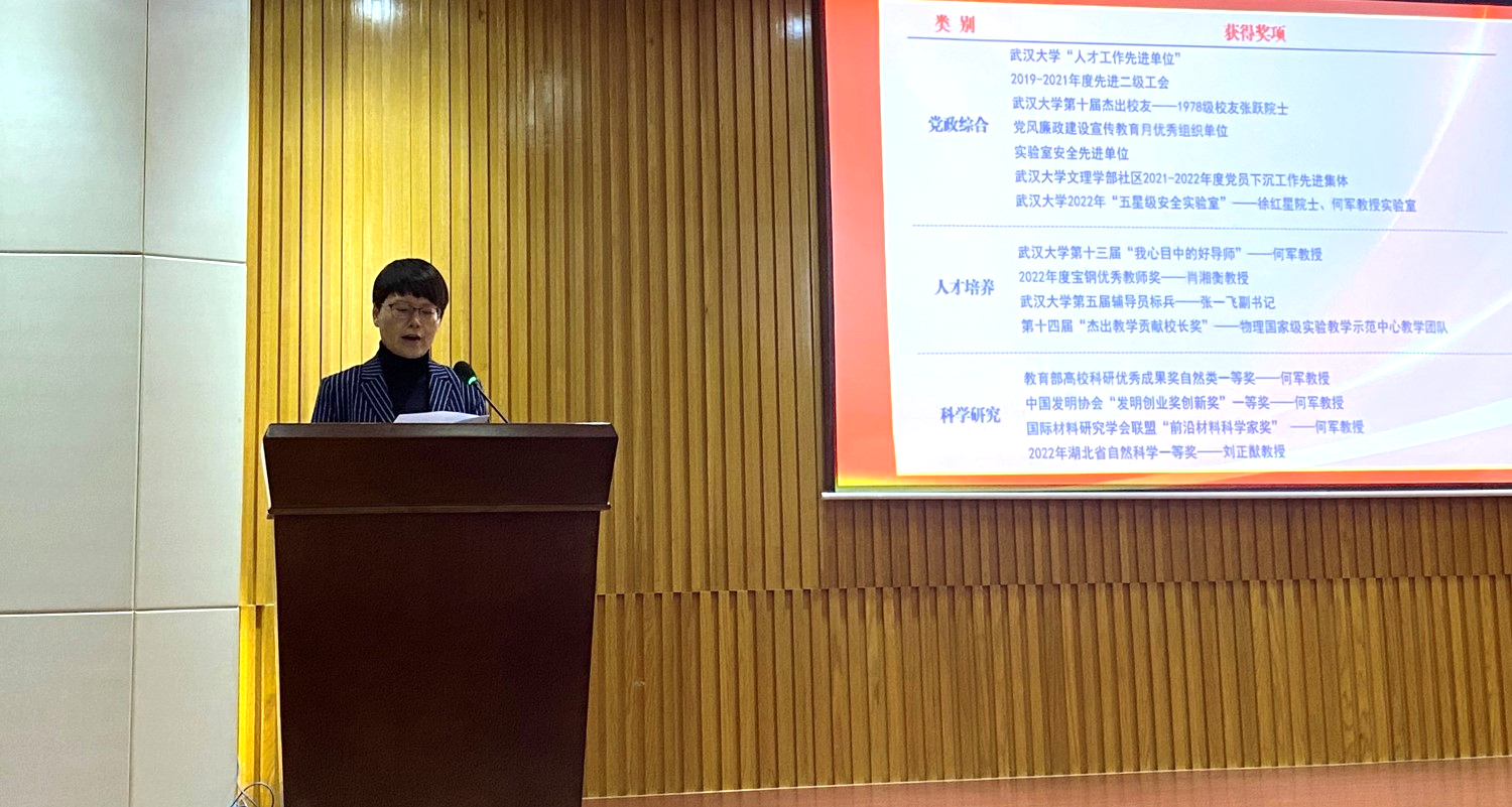 最后,何军院长强调了2023年的工作重点和方向。他表示,2023年,学院要立足实际,紧扣 “学科建设年”发展主题,在全面推进各项工作的基础上,重点推进优化学科布局、深化人才强院战略、深耕本科生能力提升计划、加强有组织科研、全力推进物理楼扩建项目建设等工作。他号召全院师生坚定信心、同心同德,埋头苦干、锐意进取,以一流业绩向130周年校庆、院庆献礼,为建设教育强国和科技强国、实现高水平科技自立自强不断贡献力量!