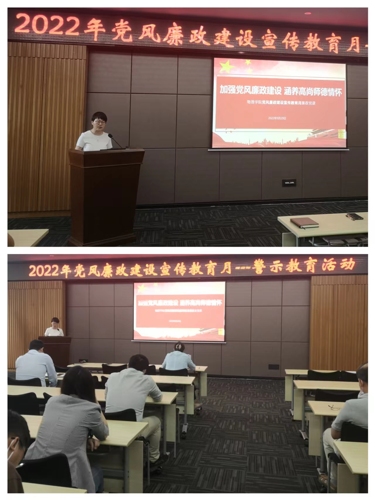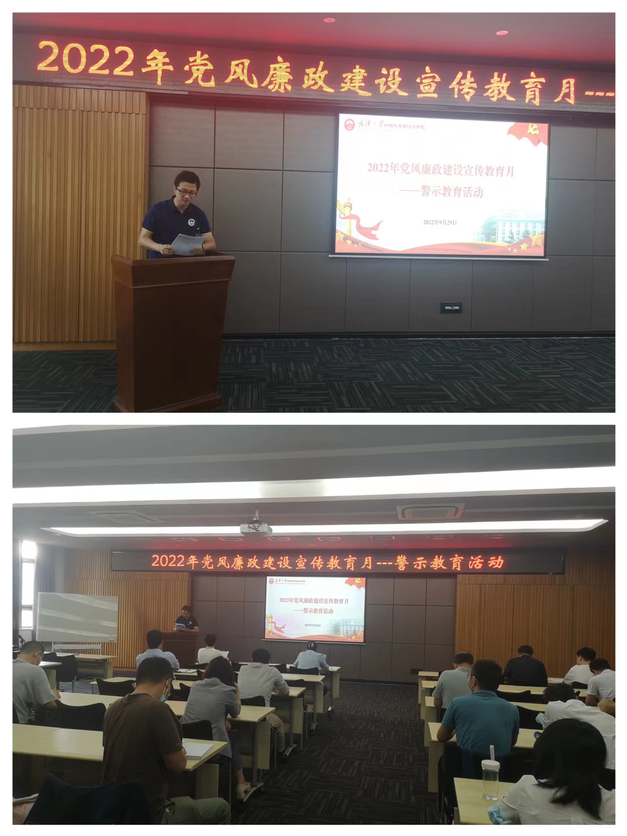 2022年9月29日上午,学院党委在新楼多功能厅组织开展2022年党风廉政建设宣传教育月之警示教育专题会议,会议包括典型案例通报、讲授党风廉政专题党课、结合实际工作中的不良现象开展检视教育、集中观看警示教育片等内容,党委书记余向红主持会议,全体教职工参加会议。