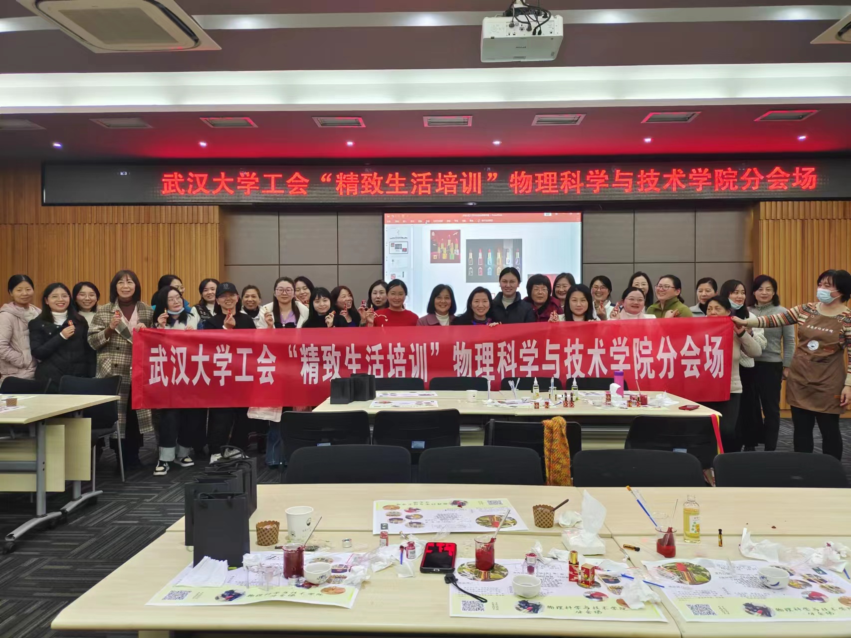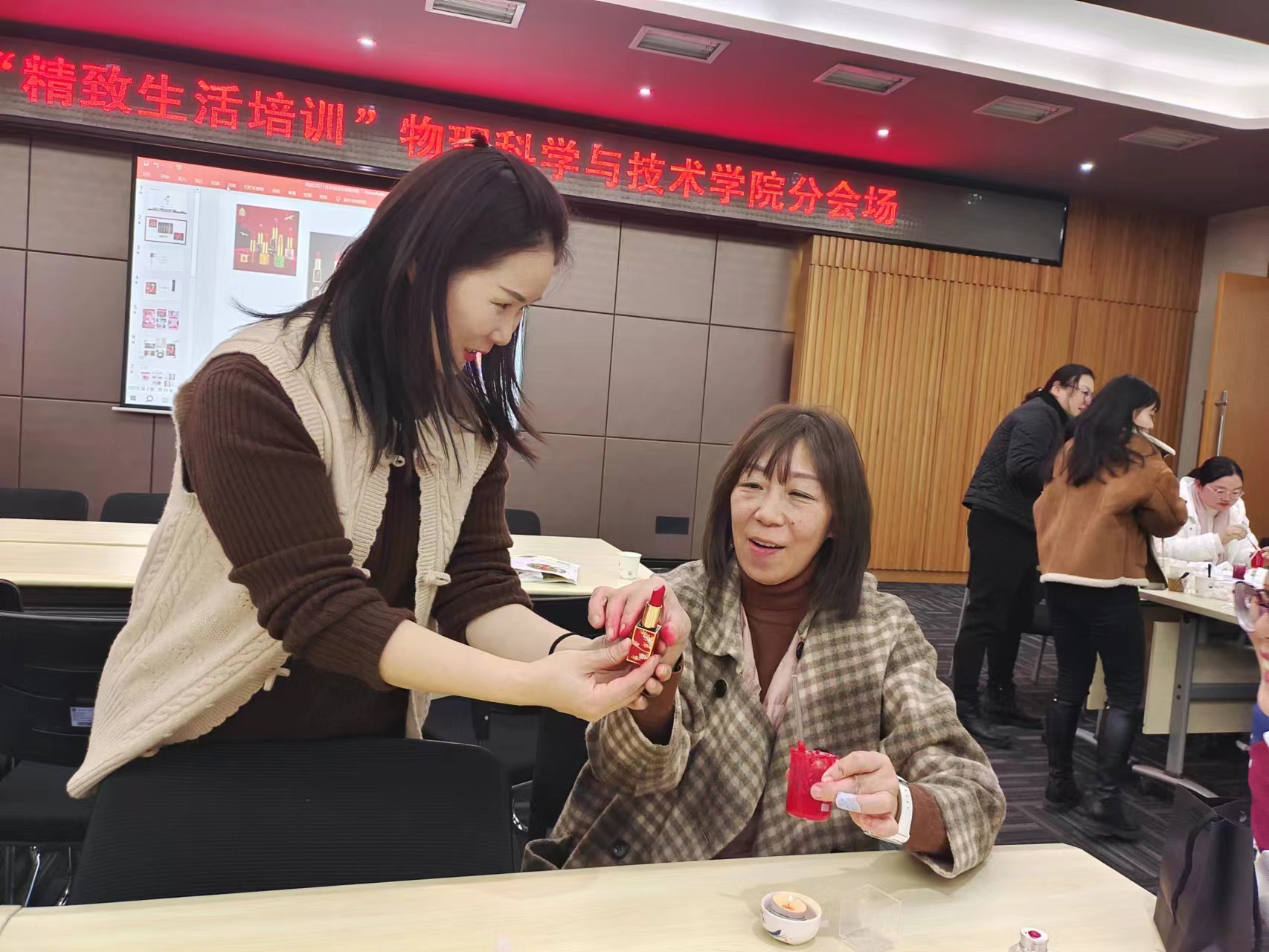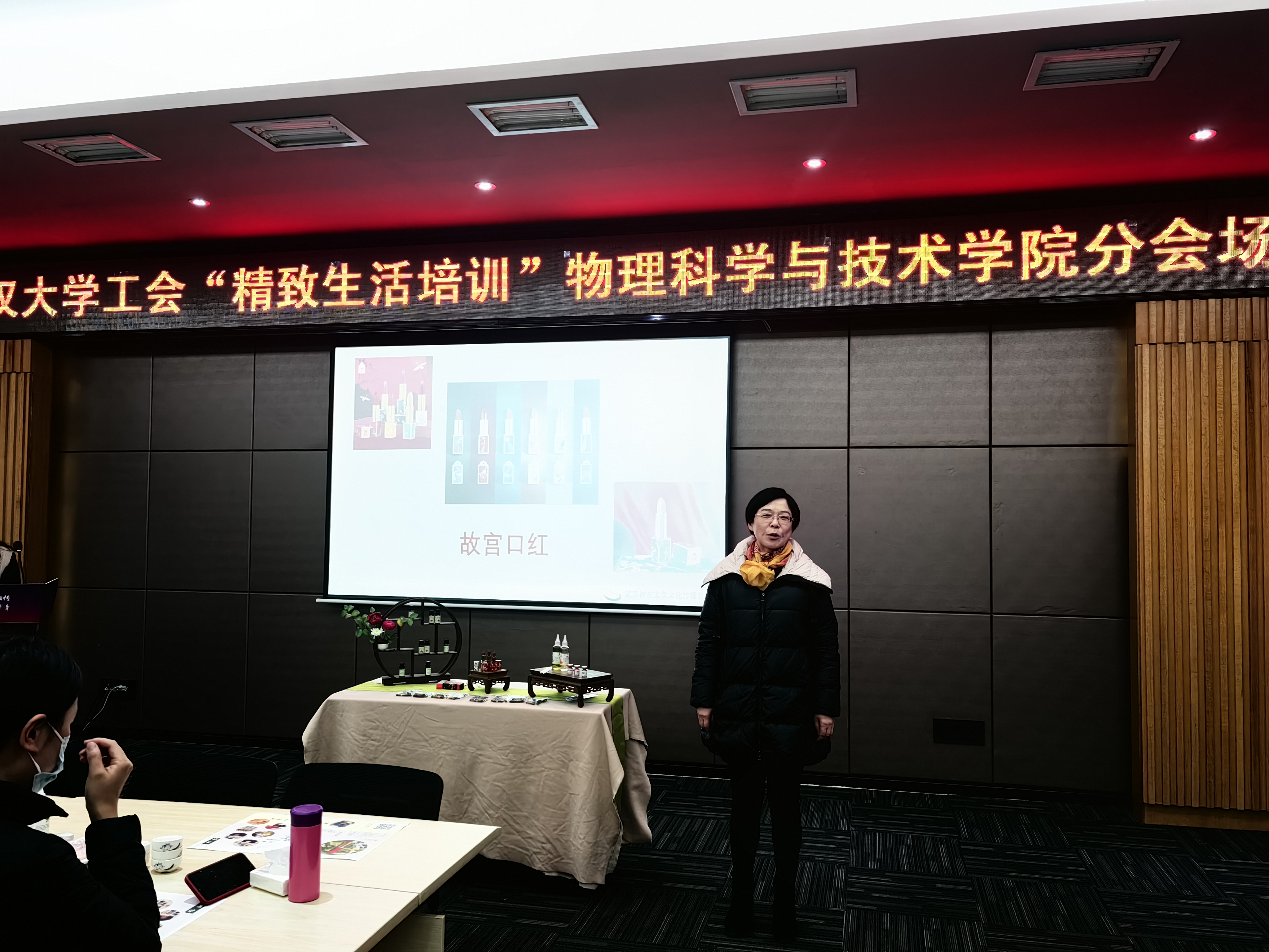 2023年11月30日,由物理学院荣幸承办的校工会 “精致生活”培训之 “故宫口红”制作活动在学院D505报告厅举行。凛冽的寒风挡不住女教工们对“故宫口红”制作的向往,来自全校各学院的50多位女教工积极参与了此次活动。校工会黄丽副主席亲临现场并致辞。