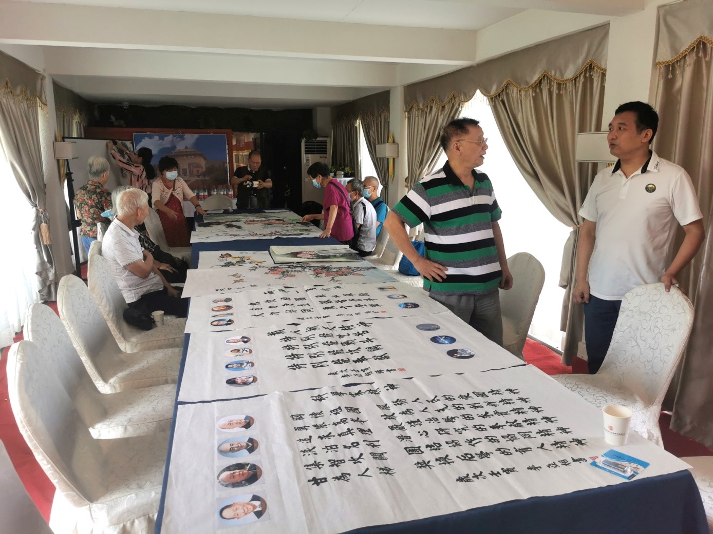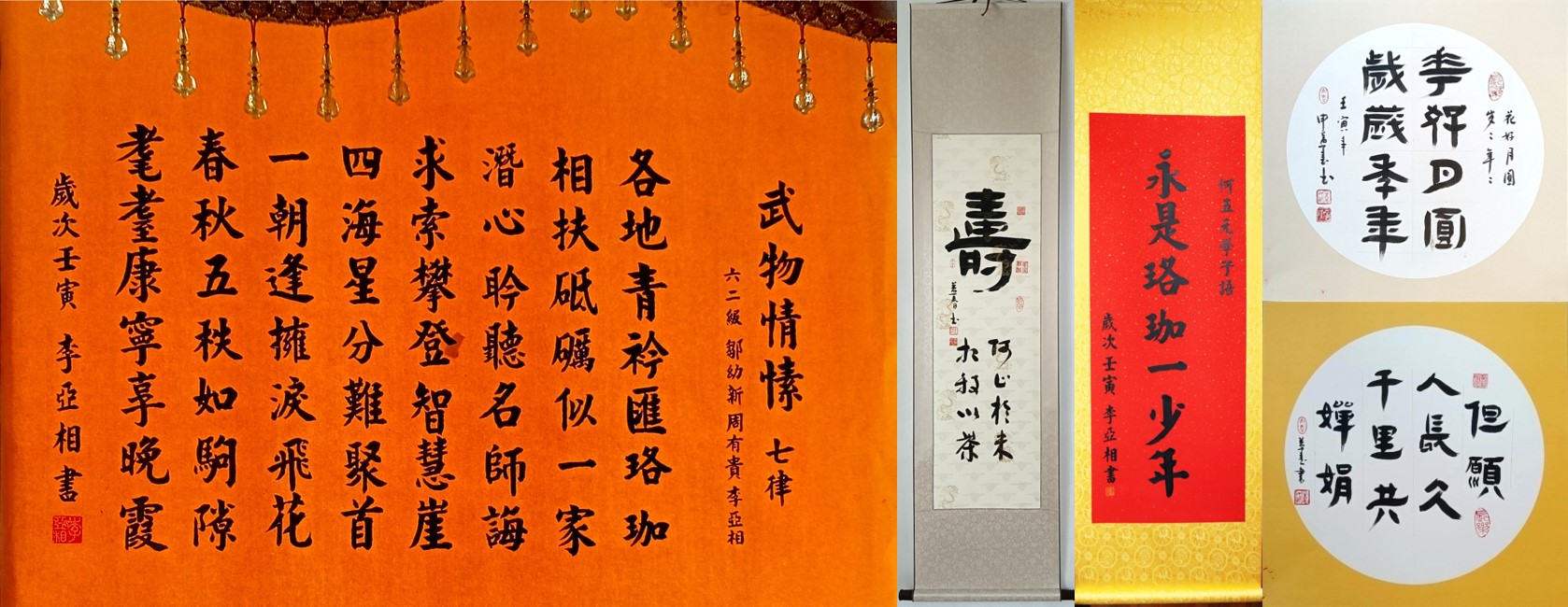 据此,60级的杨宜城和62级的李亚相合计策划组织在2022年中秋节前后举办一次《武汉大学物理广东耄耋校友康乐汇》聚会活动。这道信息一发出,居深圳的62级申益春就构思写下了大幅“寿—何止于米 相期以茶”和“但愿人长久 千里共婵娟”庆中秋的作品供会场展示。62级邹幼新(山东东营)、周有贵(海南)、李亚相(广州)以纪念进校60周年并献给广东耄耋校友康乐汇为题,合同作诗《七律 武物情愫》“各地青衿汇珞咖 相扶砥砺似一家 潜心聆听名师诲 求索攀登智慧崖 四海星分难聚首 一朝逢拥泪飞花 春秋五秩如驹隙 耄耋康宁享晚霞”,李亚相还将诗词书写在大幅纸张上供会场展示;李亚相还特制了一幅1米×1.33米武大行政大楼的摄像安放在会场显著位置,以使会场有“回珈(家)”的感觉。李亚相把《珞珈赋》作者何五元的“永是珞珈一少年”名句书写成了大幅字轴供会场展示。62级钟穗萍专心作了《九鱼跃莲池》和《雄风万里》两幅大画作供会场展示。李亚相还把应“粤二·九”联谊会秘书长杨宜城请求书写的《两弹一星精神》《载人航天精神》《科学家精神》三幅大书画供会场展示。