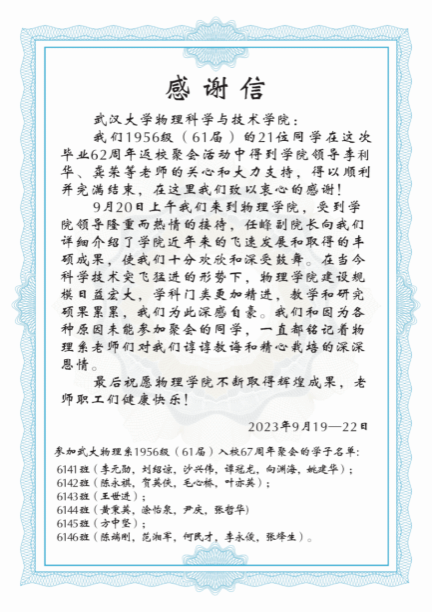 百卅物理,薪火相传。虽毕业多年,但校友们难以忘怀在武大物院的求学故事,并清晰记得学院代代传承的科学精神,这也将成为激励当代物理青年学子的精神动力,让老先生、老前辈们的科学家精神永远传承下去!光阴荏苒风华在,学院也将继续热忱欢迎各级校友回“珈”相聚,回望青春,共赴芳华,一同以最佳的状态迎接物理学院130周年华诞!