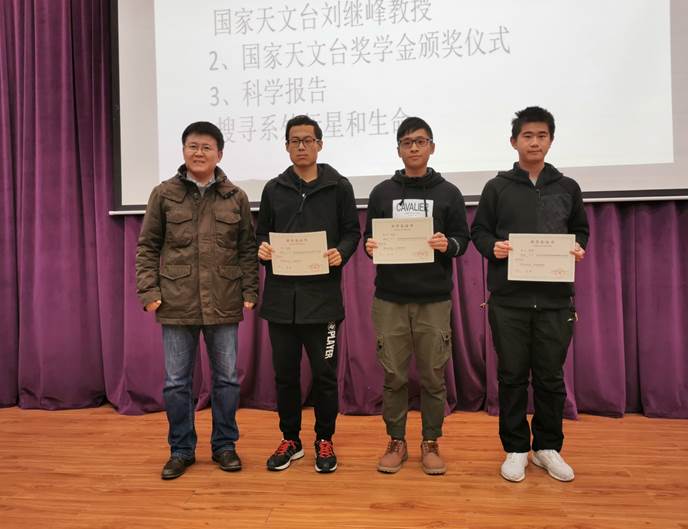 本次珞珈“理”堂别开生面,在正式讲座前,刘继峰教授为物理科学与技术学院本科生唐宇明、吴岳、詹世宏颁发“国家天文台奖学金”,鼓励同学们在天文学领域积极进取,努力拼搏!