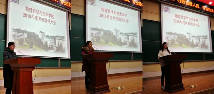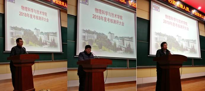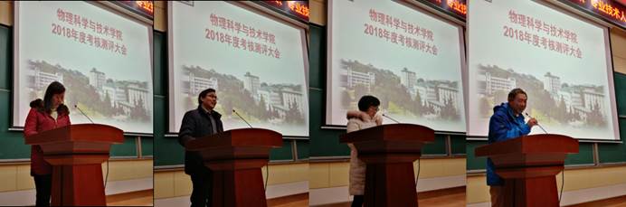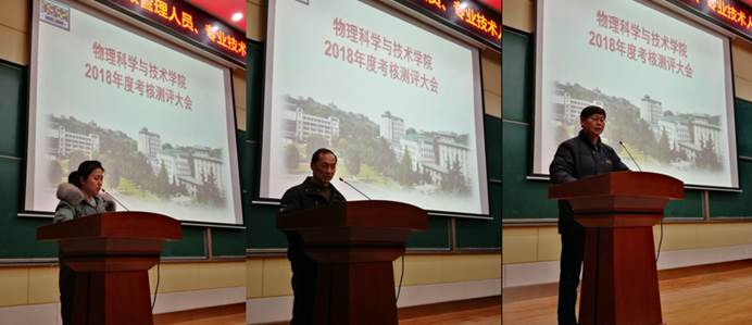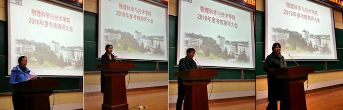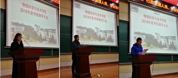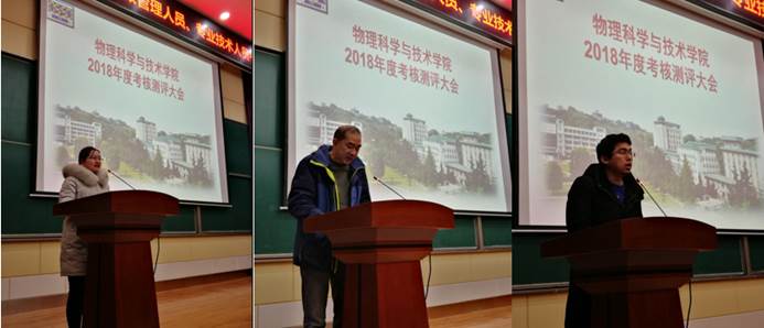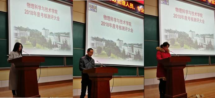 12月27日下午,物理科学与技术学院召开了2018年度考核测评大会,学院全体辅导员、办公室人员以及实验系列人员参加了现场考核。学院领导班子成员、教代会代表、本科生和研究生代表作为评委进行现场打分。