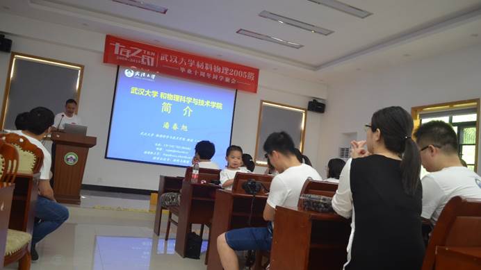 当日下午2点30分,在物理学院老楼C-215教室,十年以来的第一次班会正式开始。曾经为2005级材料物理专业授课的潘春旭教授出席了这次聚会,并首先为校友们介绍了在这十年里,武汉大学和物理学院的发展新况,大家对母校的发展感到心之振奋。之后每一位在席的校友又重新介绍了自己,介绍了他们在这十年里的经历、成就和成长。