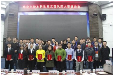 我院本科生2015级党支部近日参加华中七校本科生党支部风采大赛,同来自武汉大学、华中科技大学、武汉理工大学、中国地质大学(武汉)、华中农业大学、华中师范大学和中南财经政法大学等7所高校的10个优秀本科生党支部同台竞技。校党委副书记赵雪梅、湖北省教育厅思想政治教育与社会科学研究处处长何泽云,以及各参赛高校相关职能部门和院系负责人出席并担任评委。