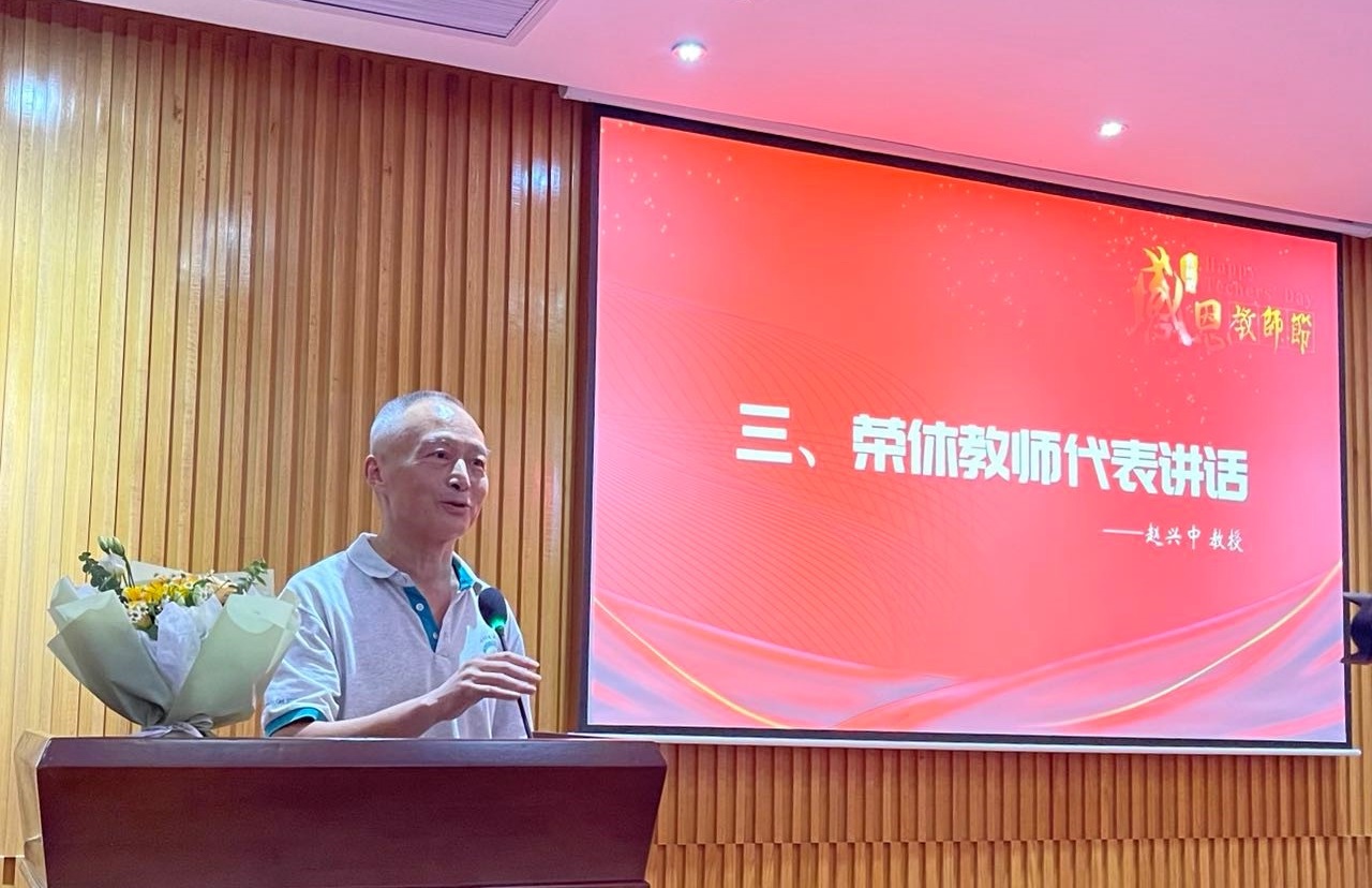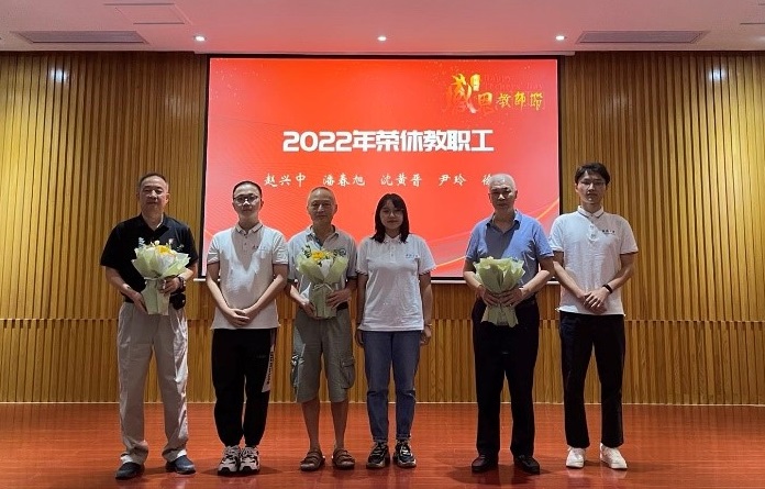 在教职工荣休仪式上,优秀学生代表向学院2022年荣休老师代表献花,赵兴中教授代表荣休教职工发言。他简要回顾了合校之初物理学院的发展历程,对学校给予物理学科的支持和关怀表示感谢,特别向物理学院一代又一代优秀的同学们表示了感谢。