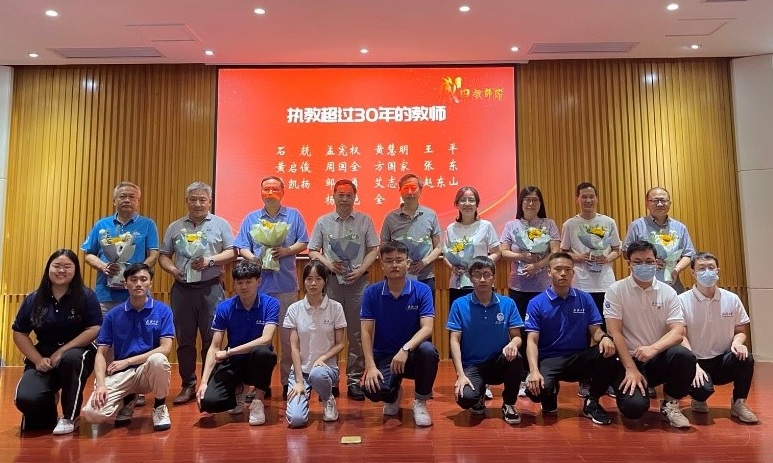 在执教超过30年的老教师表彰仪式上,石兢、孟宪权、黄慧明、王平、黄启俊、周国全、方国家、张东、李凯扬、邹勇、艾志伟、赵东山、杨艳、全红十四位老师任教超三十载获得表彰。他们几十年如一日奋战在教学、科研第一线,敬业勤勉,言传身教,深受同事与学生的喜爱与尊重。