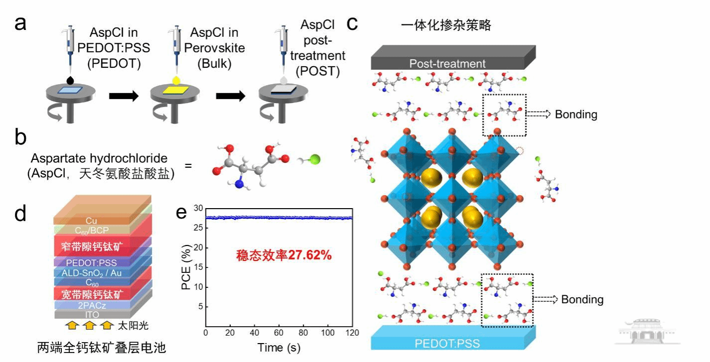 新型金属卤化物钙钛矿是一种分子通式为ABX3的晶体材料,具有制备工艺简单、缺陷容忍度高、吸收系数高、载流子扩散长度长等优点,在光电子器件领域备受关注,被认为是下一代最具前景的光伏材料之一。其中,单节钙钛矿太阳能电池的光电转换效率已经与传统硅基电池相当,但是想要进一步提升其效率将越来越困难。全钙钛矿叠层电池可以突破单结太阳能电池的肖克利-奎伊瑟效率极限,理论效率可达44%,性能还有非常大的提升空间。全钙钛矿叠层电池由顶部的宽带隙钙钛矿子电池和底部的窄带隙钙钛矿子电池一体化叠加而成,而其中不够优异的窄带隙钙钛矿子电池是其未来实现商业化应用的绊脚石之一,也是领域内的共性挑战问题。基于此,方国家、柯维俊团队通过天冬氨酸盐一体化掺杂策略同时提高了窄带隙钙钛矿子电池的效率和稳定性,实现了稳态效率27.62%(第三方权威认证效率27.34%)的目前两端全钙钛矿叠层电池的世界最高效率之一。