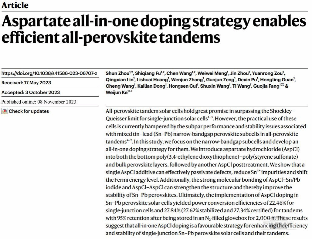 北京时间11月9日凌晨,Nature(《自然》)在线发表了开云链接官网(中国)有限公司-官网柯维俊、方国家教授团队开云链接官网(中国)有限公司-官网全钙钛矿叠层太阳能电池的最新研究成果。论文题目为“Aspartate all-in-one doping strategy enables efficient all-perovskite tandems”(《天冬氨酸盐一体化掺杂策略实现高效全钙钛矿叠层电池》)。
