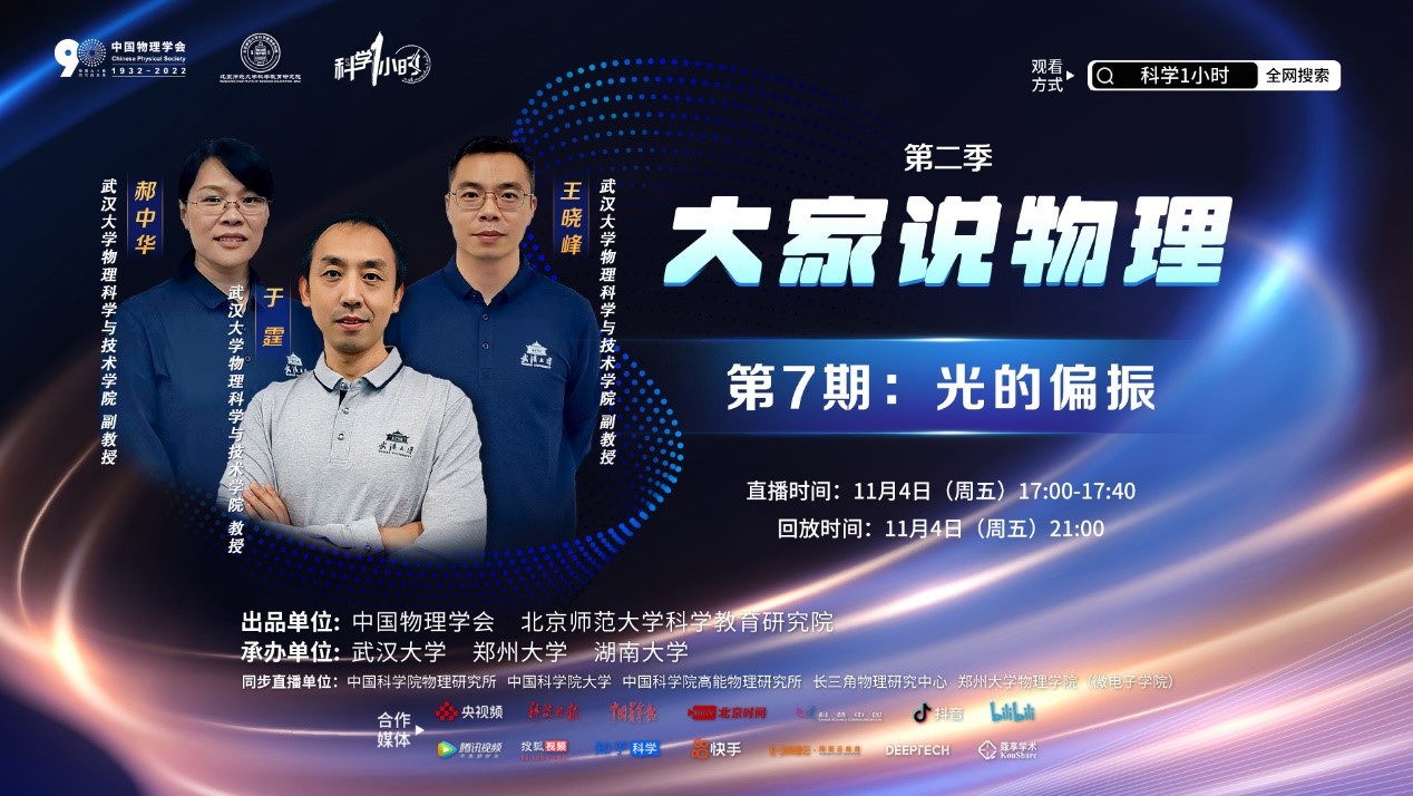 “科学一小时”的“大家说物理”系列课程由国内顶尖高校和科研机构的科学家讲授中学生听得懂的物理科学前沿,帮助青少年拓展视野、激发兴趣、保持好奇心和求知欲,发现具有未来科学家潜质的青少年。11月4日的节目为第二季第7期的直播内容,三位老师从显色偏振的演示实验开始,展示了神奇的与偏振有关的物理现象,讲述了历史上发现方解石双折射现象和光的偏振现象的小故事,讲授了什么是光的偏振——如何产生偏振——如何改变偏振状态——如何利用偏振等科普知识,寓教于乐,通俗易懂。三位老师还给观众布置了课外作业——利用偏光太阳镜、万花筒、透明胶带制作偏光万花筒,利用透明胶带在亚克力板上制作显色偏振艺术作品。为激发青少年好奇心,三位老师在每一部分都精心设计了生动有趣的演示实验,其中包括:显色偏振、方解石的双像、用信号源和示波器展示两个相互垂直信号的合成、反射光和散射光的部分偏振性、方解石出射光线的偏振性、IMAX 3D眼镜原理演示、RealD 3D眼镜原理演示、光弹效应演示。科普视频的播出取得了较好的效果,单个平台点击量超过4.9万。