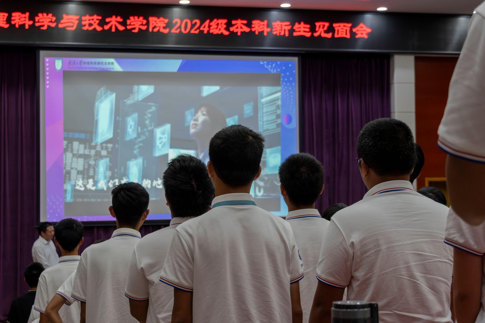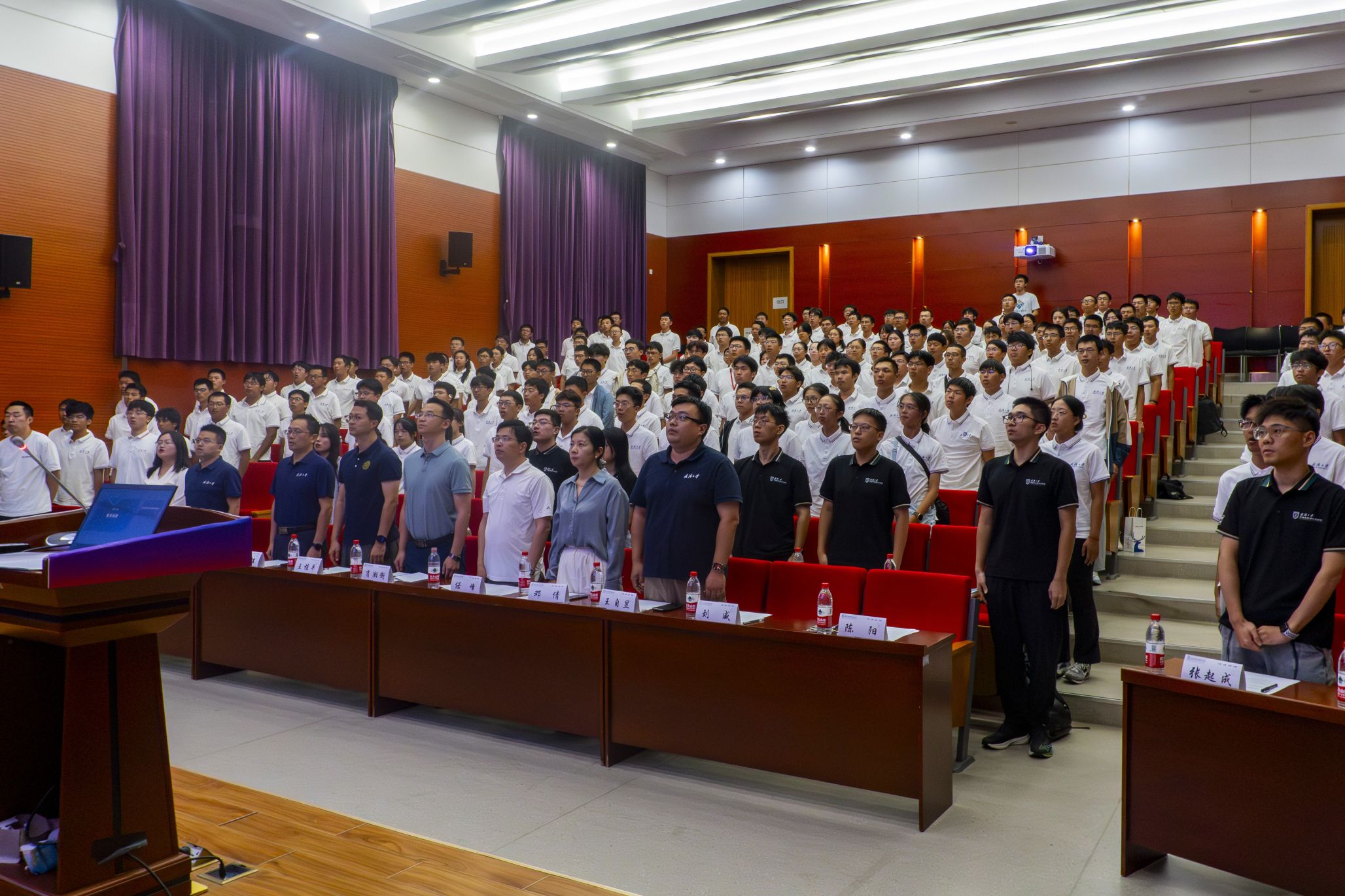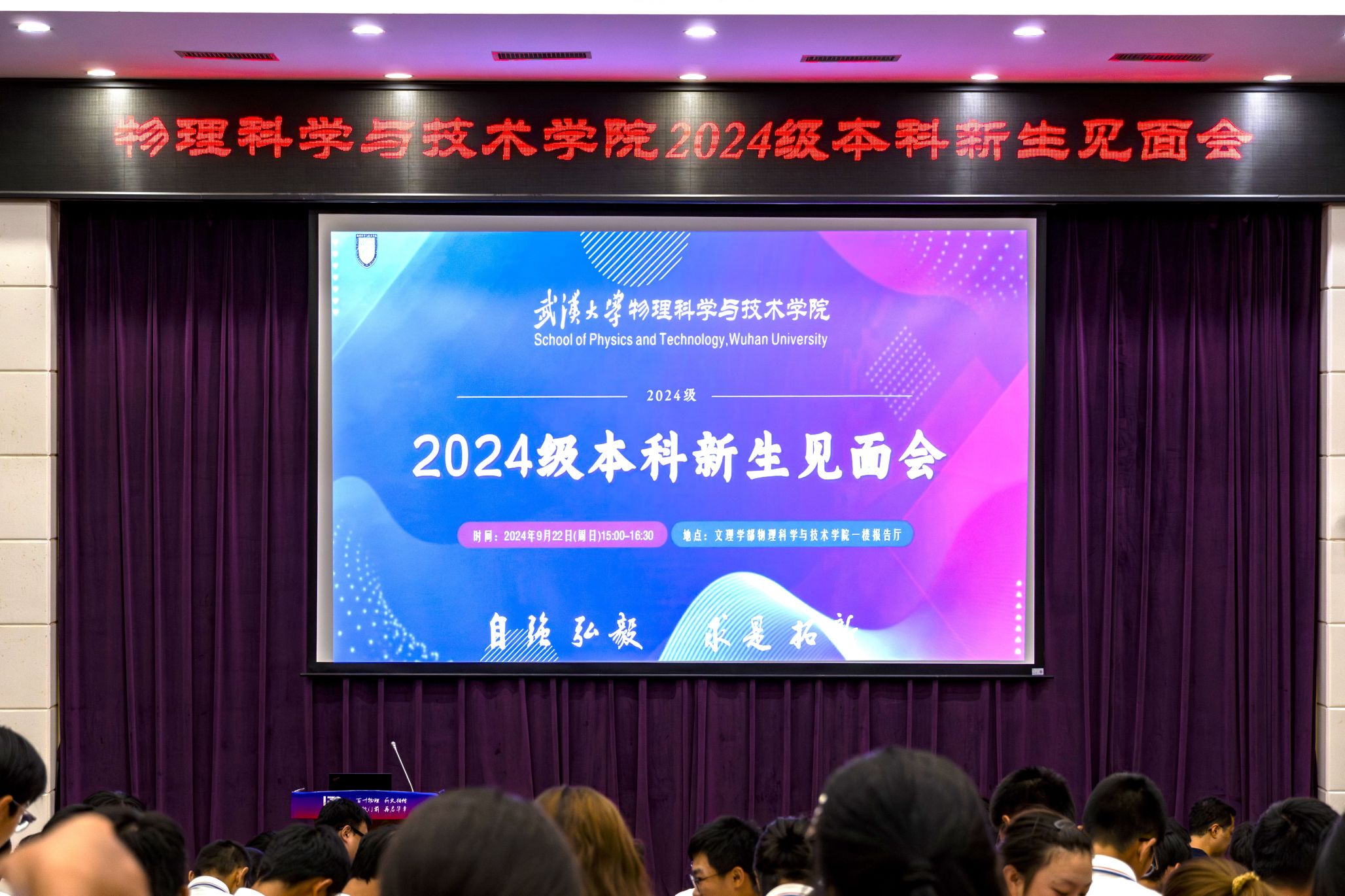 议程最后,全体师生佩戴院徽,合唱《武汉大学校歌》,物理科学与技术学院2024级本科新生见面会圆满落下帷幕。