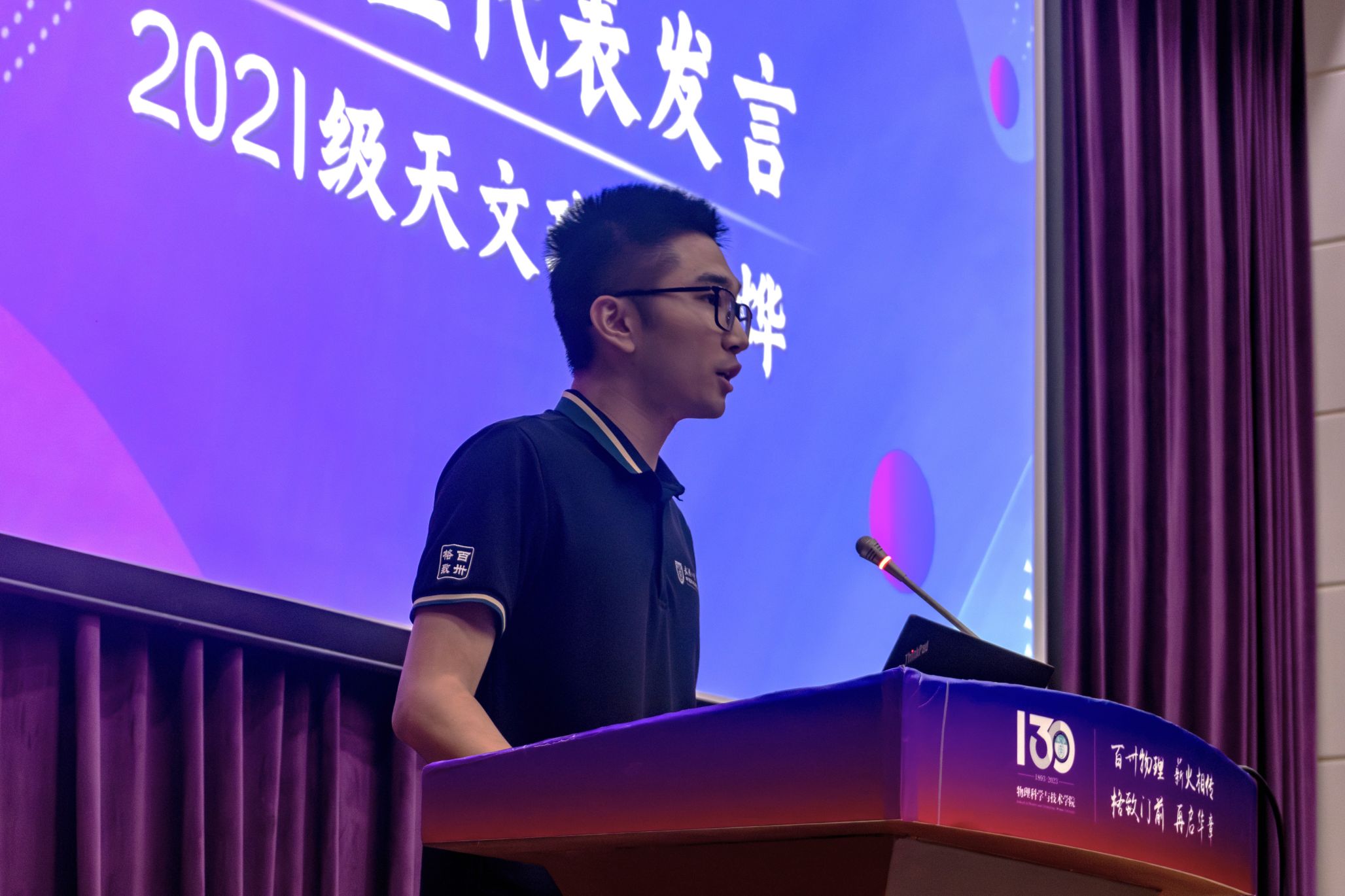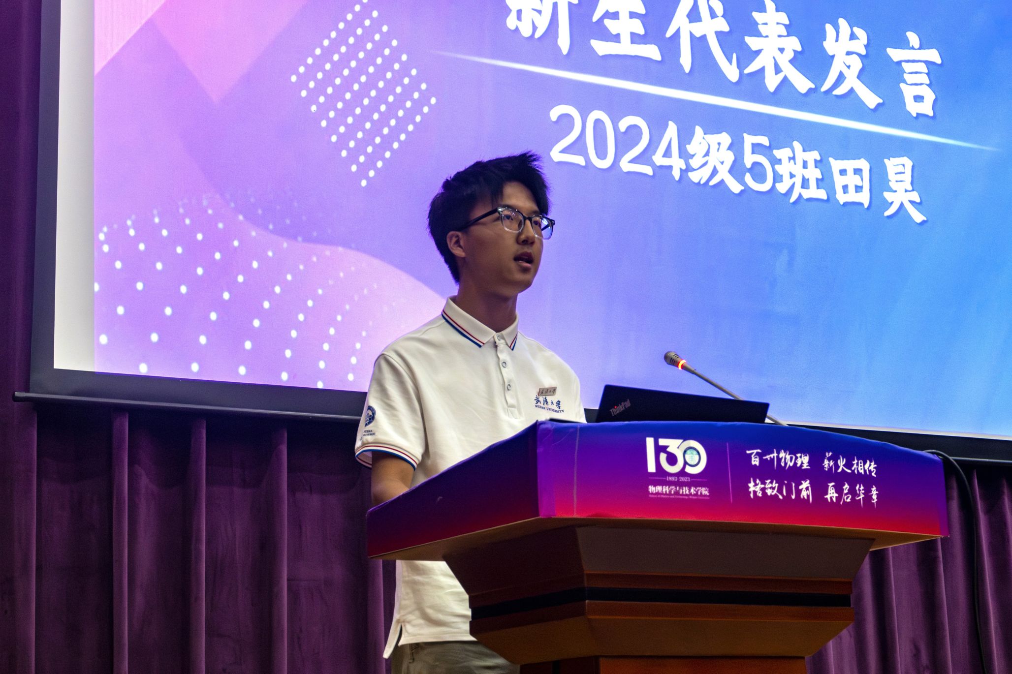 2024级5班田昊作为新生代表发言。他分享了自己与武大和物院结缘的故事,回忆了报到注册、军训、入学教育的点滴,表达了在珞珈山下增长才干、勇攀高峰的坚定信心,希望和新同学们一道,努力成为勤学笃行的物院人,在物院131周年之际传承物院精神、接续砥砺奋斗。同时也呼吁同学们在探索基础学科的过程中不忘追问本心、坚守初心、笃学砥砺,以赤子之心面对世界,不驰于空想,不骛于虚声,用知识充实自己,用实践磨练自己,让大学生涯充满温度与情怀。