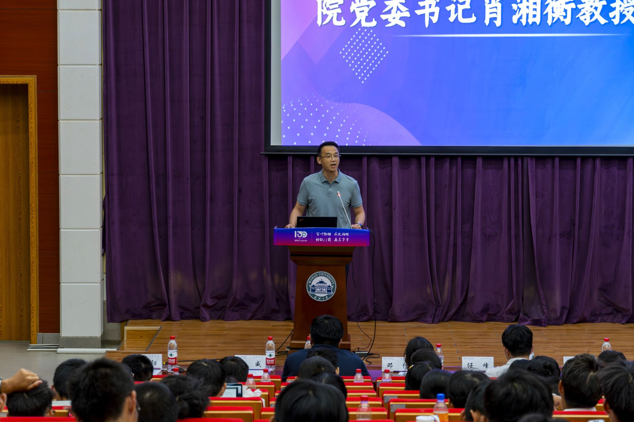 肖湘衡书记代表学院向205名2024级新生表达热烈欢迎和祝贺。他回顾了物理科学与技术学院发展历史,介绍了学院雄厚的师资力量以及本科专业设置。他以“活力、动力与钝感力”为核心主题,结合党的二十届三中全会精神与习近平总书记给武汉大学参加中国南北极科学考察队师生代表的重要回信精神,鼓励新生们从中汲取智慧与力量,领悟时代赋予青年学子的独特使命与要求,并对新生们提出了殷切三点期望。一是要保持勇于探索的“活力”,发掘自身兴趣所在,持之以恒地追求心中热爱与梦想;二是要保持勤学不辍的“动力”,培养扎实学术功底,科学规划学业生涯,为未来的科研道路奠定坚实基础;三是要保持坚韧不拔的“钝感力”,保持乐观与坚韧,以不屈不挠的精神向着既定的目标奋力前行。他勉励新生们应当坚守科研报国的初心,将个人的理想追求融入到国家的发展大局之中;学习和发扬严谨的科学精神,秉持“不兴伪事,不务虚功”的原则,脚踏实地,求真务实,用实际行动践行珞珈精神,传承百年学府的优良传统,展现出新青年应有的风采,展现出新时代基础学科发展铸就的辉煌气象!