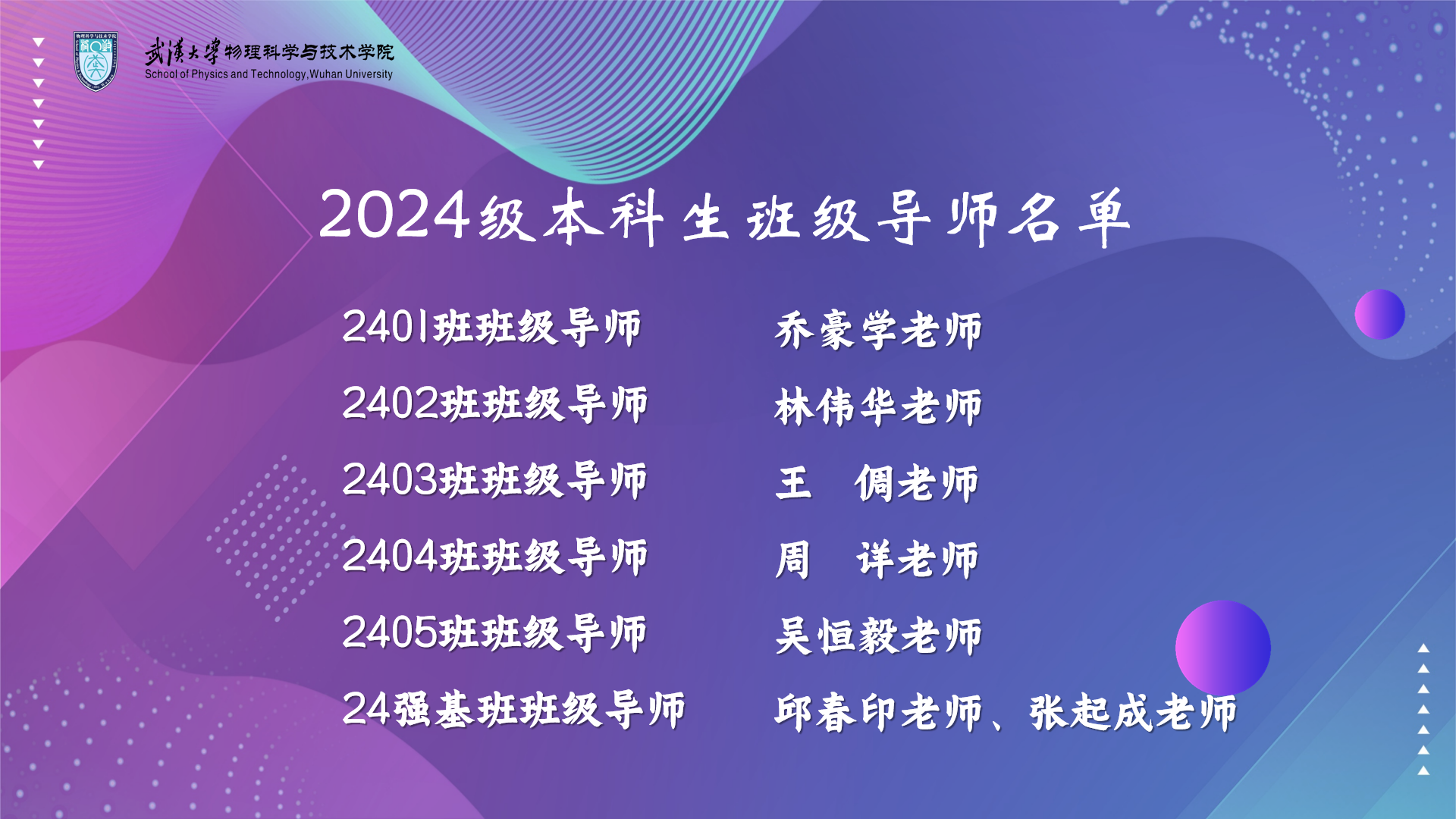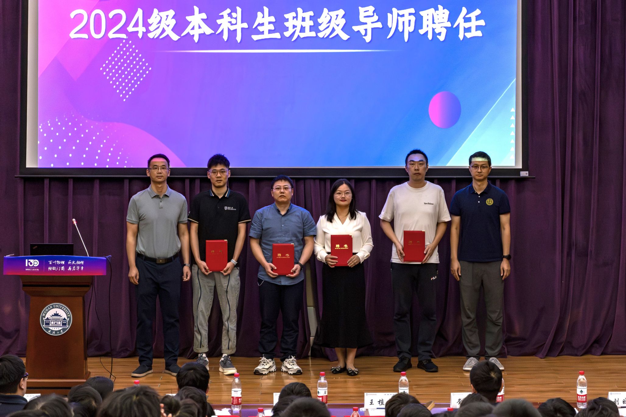 院党委书记肖湘衡、党委副书记王植平为2024级本科生班级导师颁发聘书。为进一步优化2024级本科生的教育管理体系,充分发挥广大教师在本科生思想政治教育、学业指导等方面的重要作用,形成全员育人合力,提高人才培养质量,学院为2024级本科生每个班级配备一名班级导师,巍巍师魂,班级导师们以学养德,以身示范,精耕育人沃土,引领新生在物理学科破浪前行。