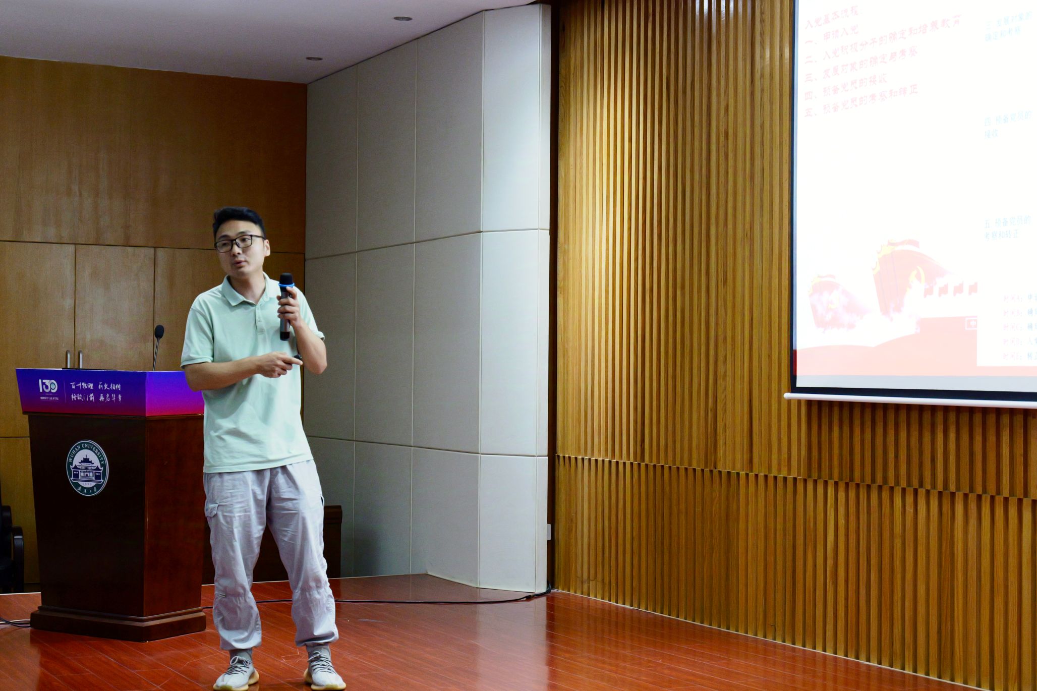 在入党启蒙教育中,学院研究生党总支宋建楠学长以亲身经历讲述了自己在党的培养下成长的故事,激励着新生们积极向党组织靠拢,并向同学们介绍了入党的基本流程——接收入党申请书和派人谈话、确定入党积极分子并进行培养教育、确定发展对象并进行考察、接收预备党员、对预备党员进行教育、考察和转正。