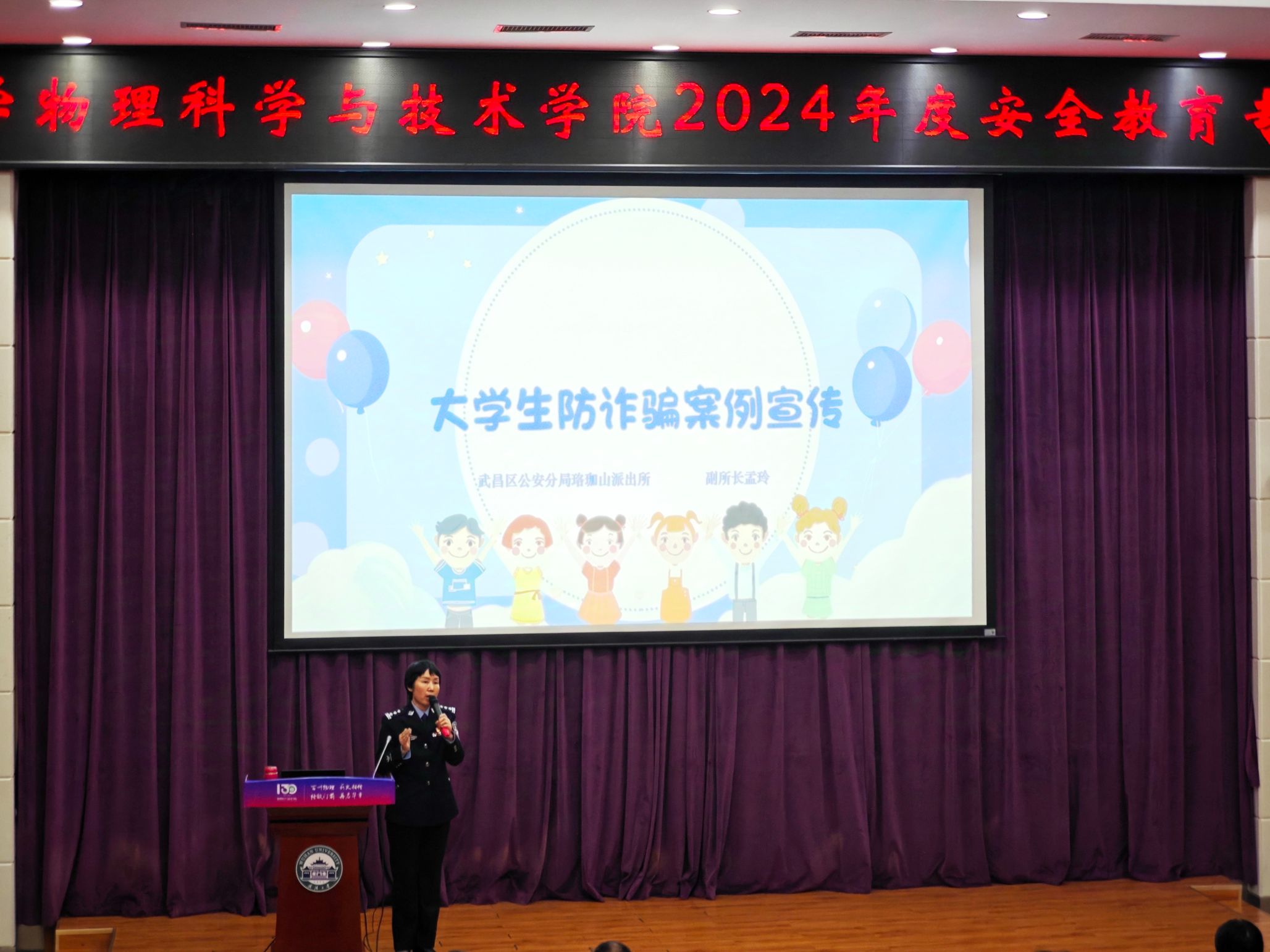 为推动平安校园、法治校园建设,积极引导大学生树立安全观念,增强识别和防范诈骗能力,提高自我保护意识,2024年10月23日晚19:00,物理科学与技术学院安全教育专题讲座在物理学院B101报告厅圆满举行,本次活动邀请武昌区公安分局珞珈山派出所副所长孟玲作大学生防诈骗安全主题报告,聚焦电信诈骗、校园安全教育等多个方面,全面引导学生辨别大学生活中可能遇到的各类诈骗案例。讲座由本科生辅导员彭瑾老师主持,2024级全体新生、各年级学生代表参与活动。