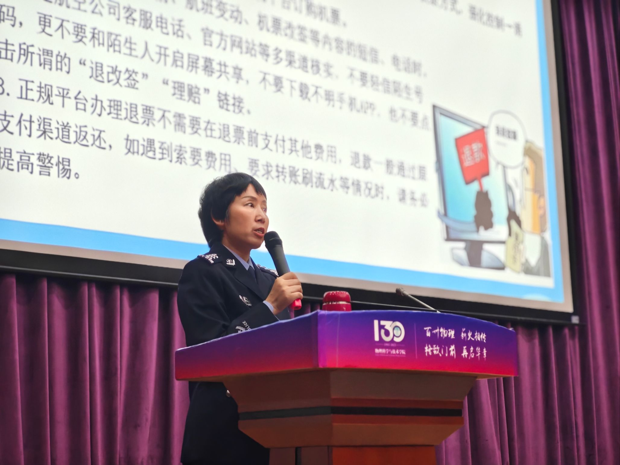 孟玲所长提醒同学们务必保护好个人信息,避免随意泄露身份证号、密码、验证码或在存在风险的平台输入个人信息,遇到借款、转账等情况务必与当事人取得联系并确认。她呼吁大家要将防诈骗知识牢记在心中,时刻提高警惕,共同维护良好的社会治安秩序和高校安全环境。