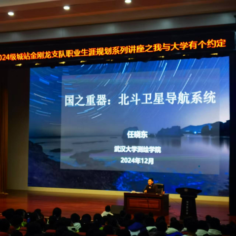 随后,武汉大学测绘学院的任晓东副教授为柳州铁一中学的师生们带来了《国之重器:北斗卫星导航系统》的精彩讲座,深入剖析了北斗卫星导航系统的前世今生与未来展望。在讲座中,任晓东博士还分享了中国在北斗系统建设过程中遇到的种种挑战与困难,以及科研人员如何克服重重难关,最终实现北斗系统的全球组网和稳定运行的经历。他鼓励同学们要学习科研人员坚韧不拔、勇于创新的精神,为国家的发展贡献自己的力量。