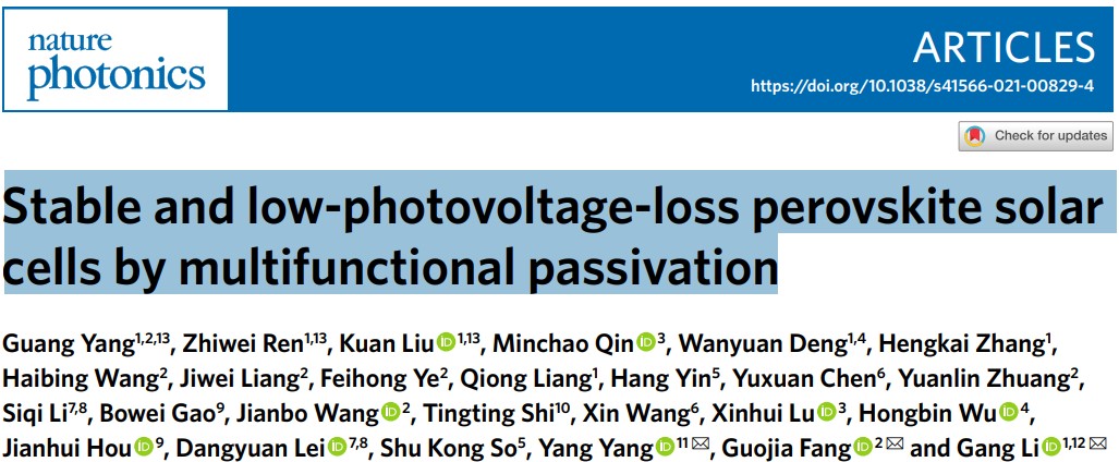 近期Nature Photonics《自然光子学》在线发表了武汉大学与香港理工大学以及加州大学洛杉矶分校的合作研究成果。论文题为“Stable and low-photovoltage-loss perovskite solar cells by multifunctional passivation”(《多功能钝化实现稳定、低开路电压损失的钙钛矿太阳能电池》)。