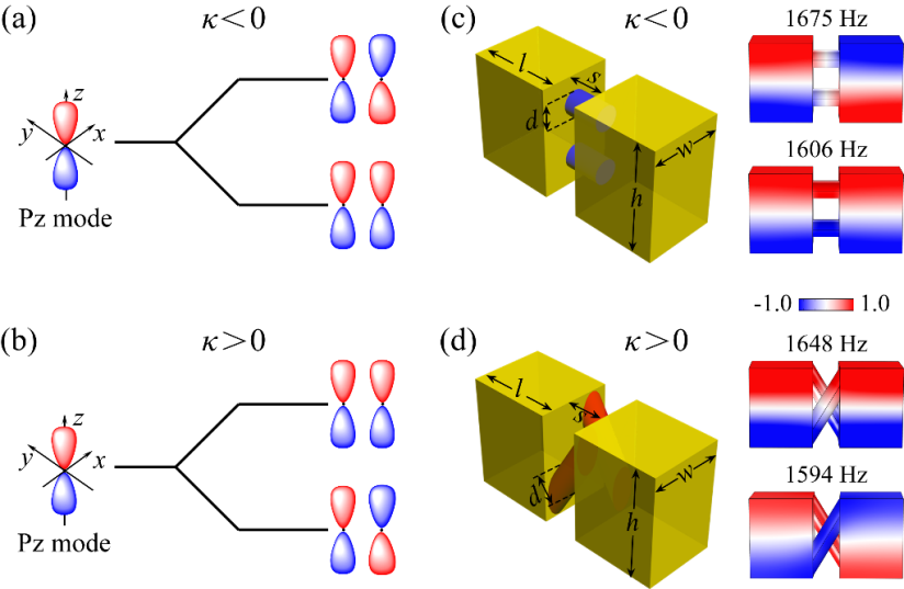 最早提出且极具代表性的高阶拓扑绝缘体是二维四极子拓扑绝缘体。对比于其它二维高阶拓扑绝缘体,四极子拓扑绝缘体具备手性对称性,其角态(即零维边界态)钉扎在体带隙中间,从而更具拓扑稳定性。尽管受到人们的广泛关注,迄今为止,相关的实验研究依然相当有限。究其原因在于,四极子拓扑绝缘体要求体系同时具备正和负的实耦合——这是一个非常苛刻的条件。这项研究介绍了一个简单直接、易于实施的方案设计声学耦合的符号(图1),构建了严格满足原始四极子拓扑绝缘体紧束缚模型的声学类比(图2),进而实验观察到了体系的层级拓扑特性(图3)。这些具有拓扑鲁棒性的带隙态可望在声学传感或声能捕获等方面获得应用。