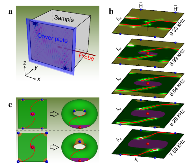 基于三维手性声子晶体,这项研究实验报道了二次型外尔点及其相应的双螺旋拓扑表面态。区别于现有的“非常规准粒子”,如三重或四重线性简并的自旋-1外尔点和荷-2狄拉克点,这里的二次型外尔点是二重简并点,在其附近沿两个方向是抛物型、第三个方向是线性(见图1)。除以上反常的体色散特征外,还实验揭示了奇异的双螺旋拓扑表面态,它从二次型外尔点出发,终止于两个常规的线性外尔点,进一步为这种非常规的拓扑节点提供了确凿的实验证据(见图2)。