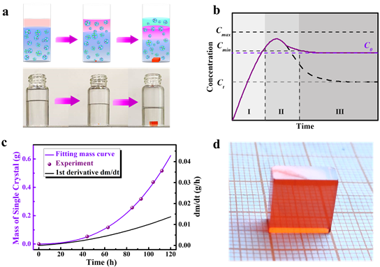近年来,卤化物钙钛矿材料在光电领域得到了广泛应用,且取得了极大进展。钙钛矿单晶作为研究钙钛矿本征特性及光电器件的理想材料,已被广泛地研究。目前,钙钛矿单晶的制备主要采用逆温度结晶法(ITC)、反溶剂蒸发辅助结晶法(AVC)和低温梯度结晶法(LTGC)等方法。这些方法的原理都是基于逆溶解度,通过改变温度或溶剂成分以改变前驱体浓度达到过饱和结晶。 采用ITC或LTGC生长单晶时需要较高的温度(从室温升高到90或60℃)。然而,已有报道表明,钙钛矿单晶生长温度越高,其缺陷密度就越高;升温或降温产生的热对流会对钙钛矿单晶结构产生不利影响,容易生成孪晶或多晶。另外变温速率的精确控制非常困难,从而影响钙钛矿单晶质量和相关器件性能。因而开发一种恒低温钙钛矿单晶的生长方法具有重要意义。