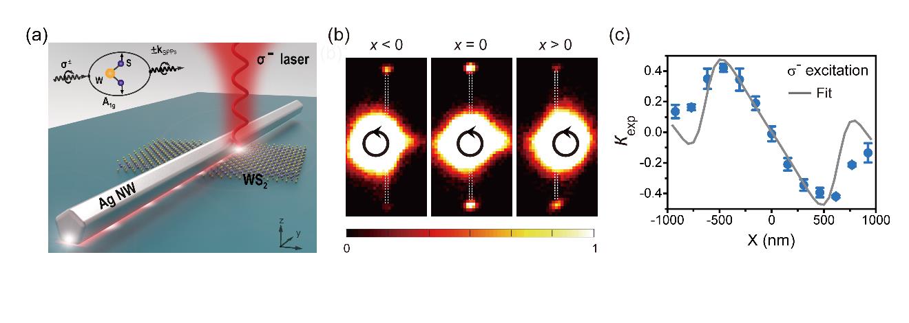 图 (a) 手性拉曼的定向耦合的结构体系:多层二硫化钨上的银纳米线;(b)二硫化钨的拉曼成像;(c)不同激光光斑-银线距离下的拉曼光的定向性。