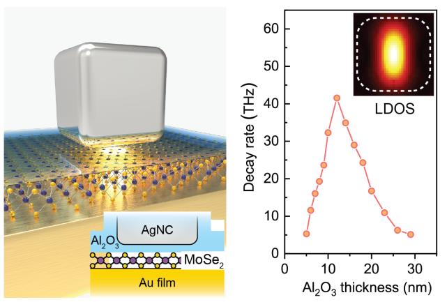 图二 银纳米立方-二硒化钼-金膜组成的复合纳腔中的超快衰减速率的测量与调制