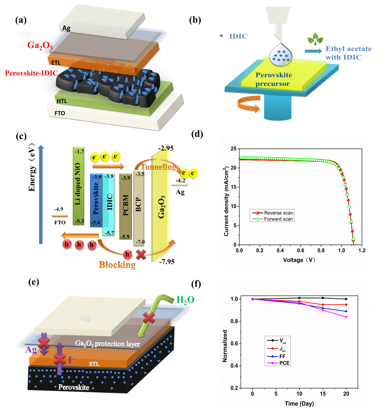 我院方国家教授课题组,与刘昌教授课题组和美国托莱多大学鄢炎发教授合作,将宽带隙金属氧化物半导体材料氧化镓(Ga2O3)应用在倒置结构的钙钛矿太阳能电池中作为电子隧穿层和保护层。 研究人员使用原子层沉积工艺在金属电极和电子传输层界面沉积了高质量超薄的Ga2O3纳米层。研究发现,一方面,由于薄的Ga2O3层能够使电子有效地隧穿,同时Ga2O3宽的带隙和低的价带位置可大大抑制了载流子的界面复合,有效改善了界面的接触,减少了漏电情况,提升了电池性能。另一方面,Ga2O3作为无机材料,显现了出色的环境稳定性。它能够抑制银电极材料向钙钛矿吸光层内的渗透,隔绝空气中水分对电池的直接侵蚀,从而使器件的稳定性能得到明显的改善。