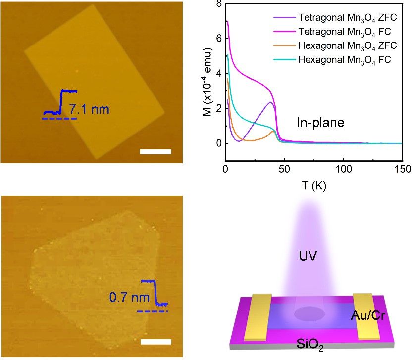 在这里,我们首次报道了二维单晶尖晶石型金属氧化物的相控合成,并进一步证明了其铁磁性和半导体性质。(1) 为了突破上述限制,我们首次开发了一种范德华外延策略来合成相可控的高质量Mn3O4纳米片,所获得的四边形和六边形Mn3O4纳米片的厚度可以分别降低到7.1 nm和一个单胞厚度 (0.7 nm)。本文还首次系统地研究了相相关的微观结构和拉曼散射。(2) 磁性测量和理论计算揭示了一种典型的铁磁性半导体,表明二维Mn3O4在磁存储技术方面的潜力。(3) 得益于其超薄的几何结构,二维Mn3O4纳米片具有优异的紫外探测性能,具有0.126 pA/Hz1/2的超低噪声功率密度、良好的探测比和快速的响应时间,优于其他大多数已报道的一维和二维紫外光电探测器。更重要的是,这种通用而简便的方法将对其他可调材料体系的相工程产生启发。