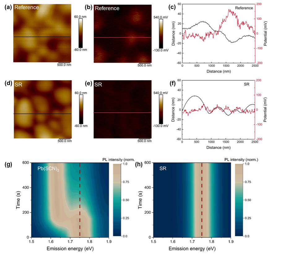 图(a-f)为不同的钙钛矿薄膜的开尔文探针显微镜(KPFM)测试数据。参考样品中掺入了一定量的硫氰酸铅(Pb(SCN)2)来调控钙钛矿的结晶,但同时导致钙钛矿薄膜中产生了残留的碘化铅。表面反应(Surface reaction, SR)是在参考样品的基础上进行。数据表明,钙钛矿薄膜的表面形貌(图 a和d)和表面电势(图 2b、e)呈现了一定的相关性。图 c 和 f 中为标记区域的高度起伏和表面电势的线性分布图。对于参考样品,位于晶界处的平均电势比晶面高约 120 mV。在表面反应后,晶界处的电势下降,并达到与晶粒表面相当的水平。图g和h 为参考和表面反应的样品的光致发光谱随时间演化的图像。可以清晰地看到,原本严重的相分离现象得到了有效的抑制。作者推断,参考样品中高电位区域是由靠近上界面(钙钛矿/C60界面)附近的PbI2残留物引起的,并且它促进了碘离子从晶面向晶界的迁移,导致在晶界处形成了富碘相。