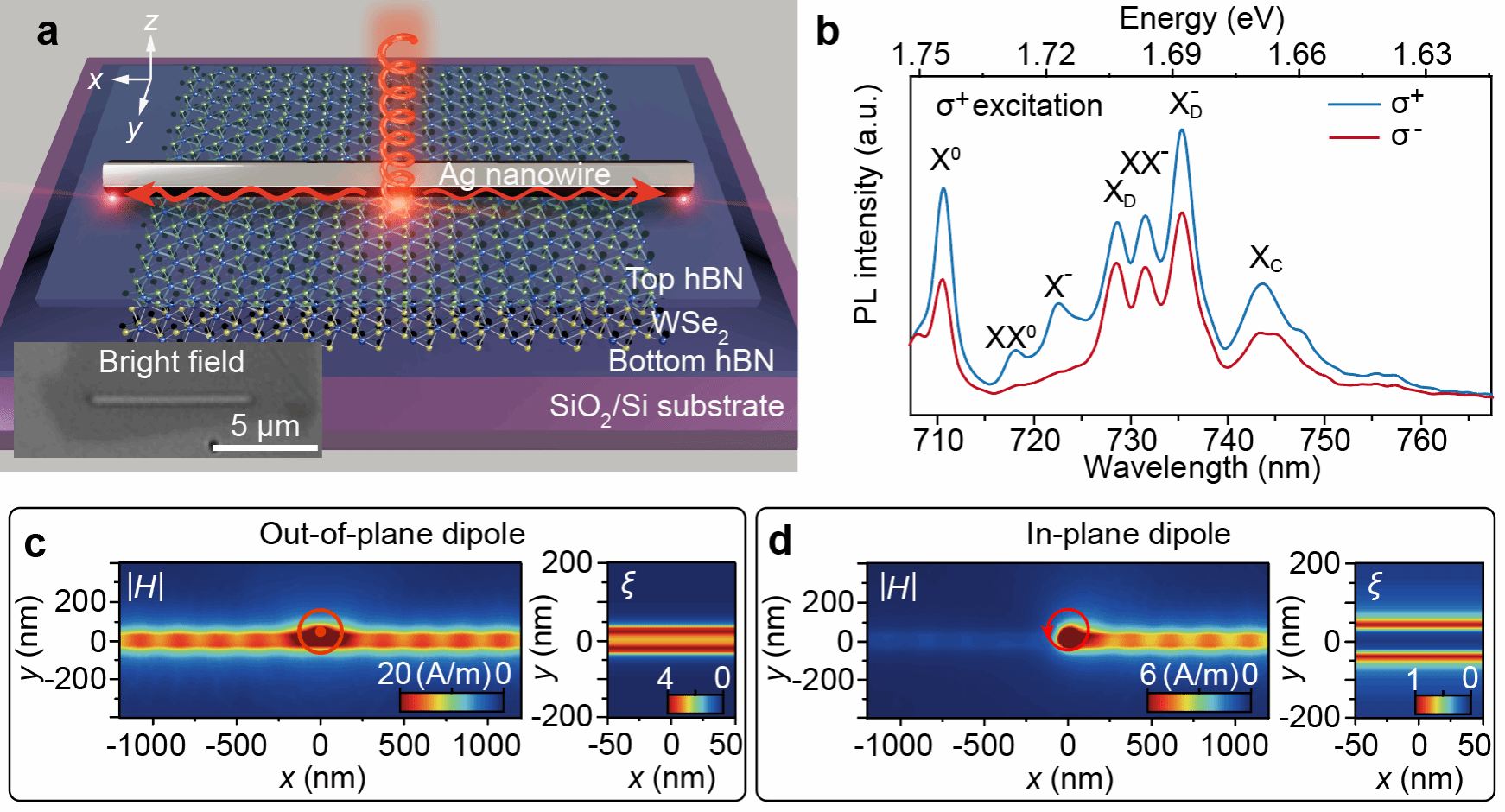 图a. 样品结构示意图,b. 无Ag纳米线位置时圆偏依赖PL光谱,c. 数值仿真得到的面外偶极子电场分布,d. 面内圆偏偶极子的电场强度分布。